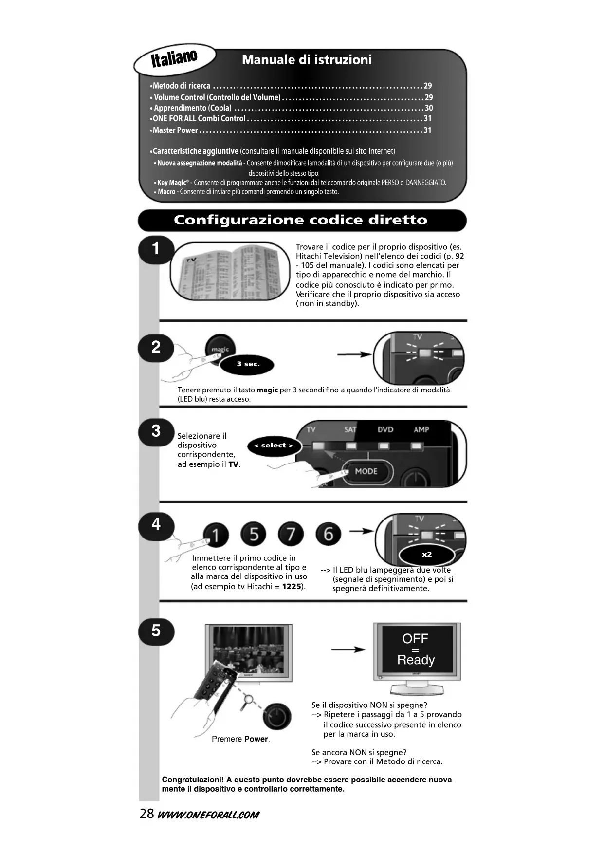 T rovare il codice per il proprio dispositivo (es. H itachi Television) nell’elenco dei codici (p. 92- 105 del manuale). I codici sono elencati pertipo di apparecchio e nome del marchio. Ilcodice più conosciuto è indicato per primo. V erificare che il proprio dispositivo sia acceso ( non in standby). Tenere premuto il tasto magic per 3 secondi fino a quando l'indicatore di modalità (LED blu) resta acceso.Immettere il primo codice inelenco corrispondente al tipo ealla marca del dispositivo in uso(ad esempio tv Hitachi = 1225).--> Il LED blu lampeggerà due volte (segnale di spegnimento) e poi si spegnerà definitivamente.Se il dispositivo NON si spegne? --> Ripetere i passaggi da 1 a 5 provandoil codice successivo presente in elencoper la marca in uso. Se ancora NON si spegne? --> Provare con il Metodo di ricerca.< select >Selezionare il dispositivocorrispondente,ad esempio il TV.3 sec. 2
