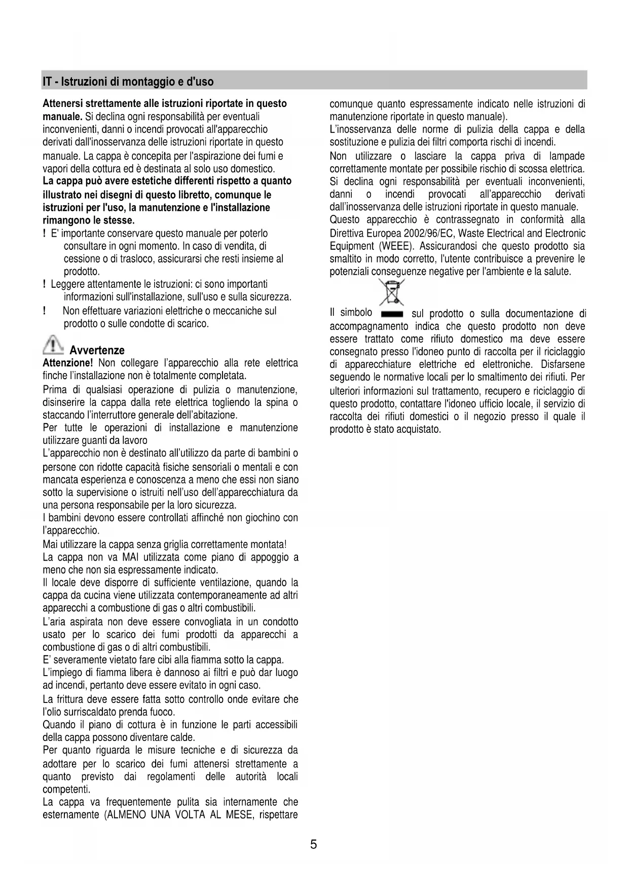 manuale. La cappa è concepita per l'aspirazione dei fumi e