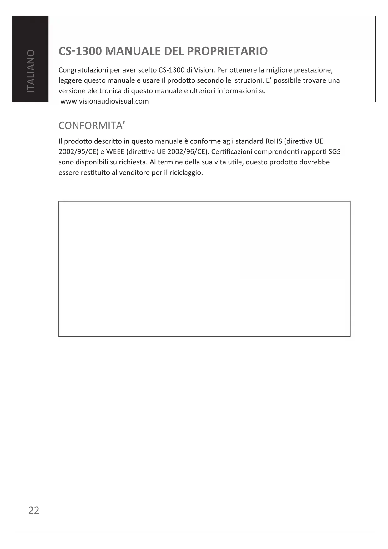 Scarica le istruzioni per il tuo Altoparlante in formato PDF gratuitamente! Trova il tuo manuale CS1300 - VISION e riprendi in mano il tuo dispositivo elettronico. In questa pagina sono pubblicati tutti i documenti necessari per l'utilizzo del tuo dispositivo. CS1300 del marchio VISION.