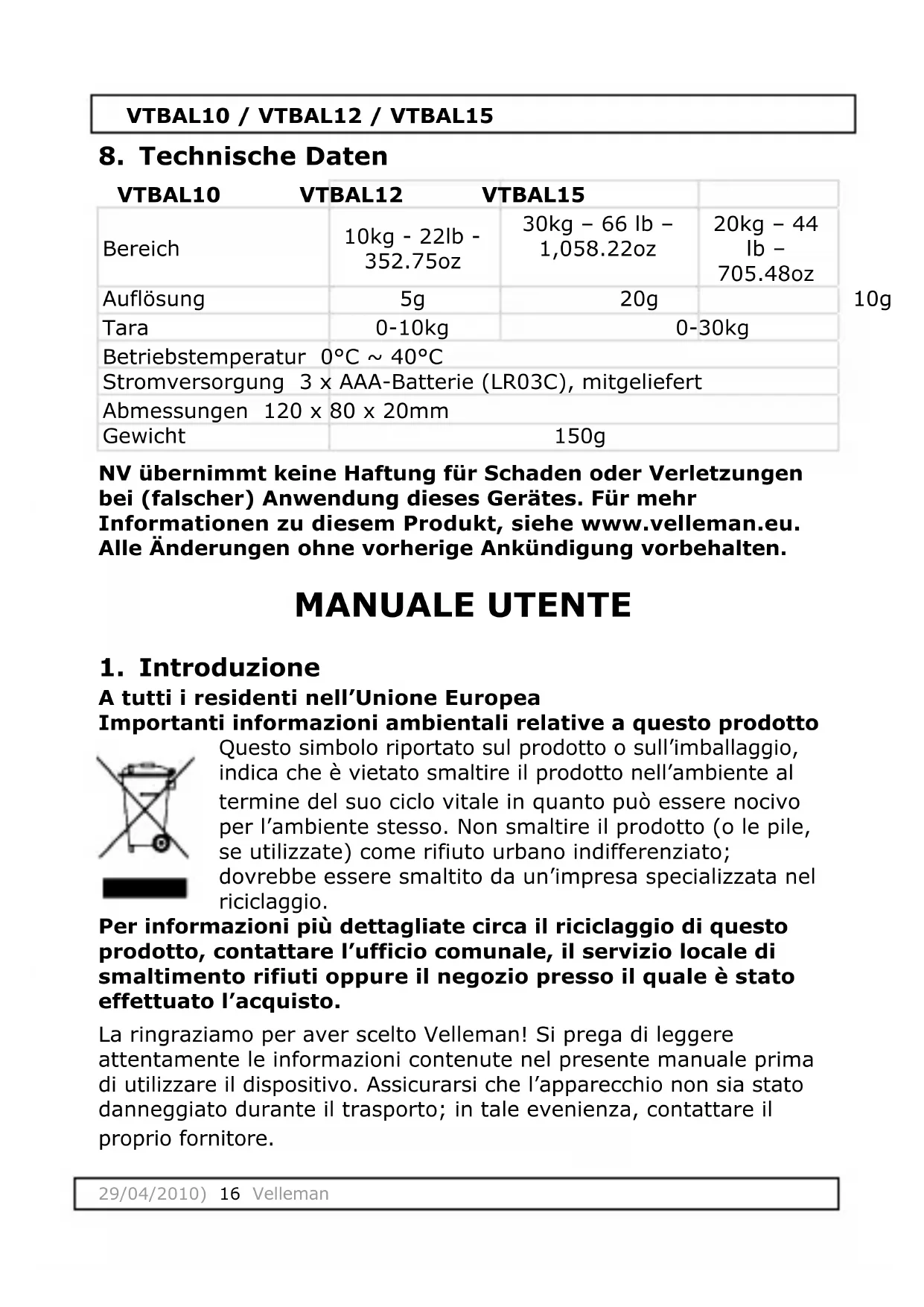VTBAL15 - Bilance VELLEMAN - Manuale utente e istruzioni gratuiti