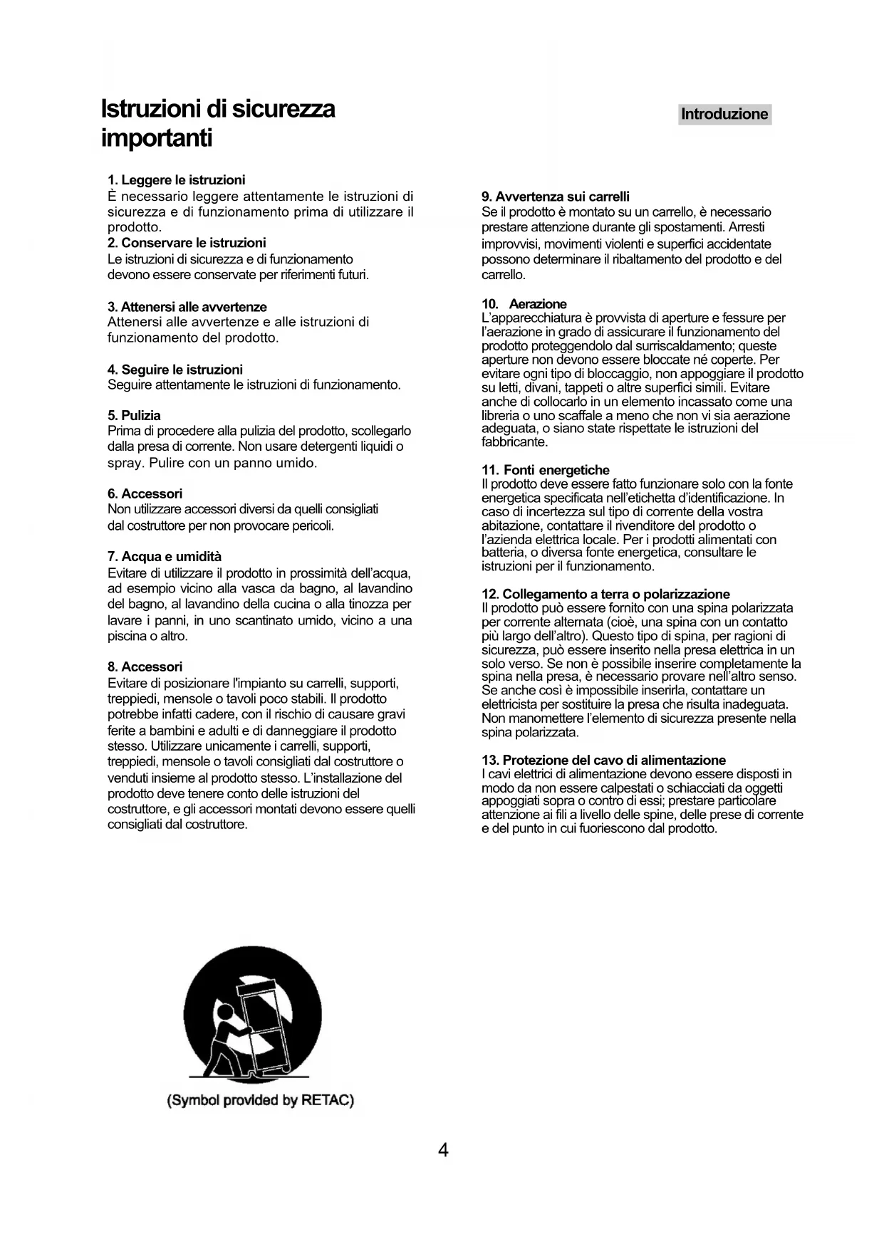 I cavi elettrici di alimentazione devono essere disposti in modo da non essere calpestati o schiacciati da oggetti appoggiati sopra o contro di essi; prestare particolare attenzione ai fili a livello delle spine, delle prese di corrente e del punto in cui fuoriescono dal prodotto. Introduzione 4Istruzioni di sicurezza importanti