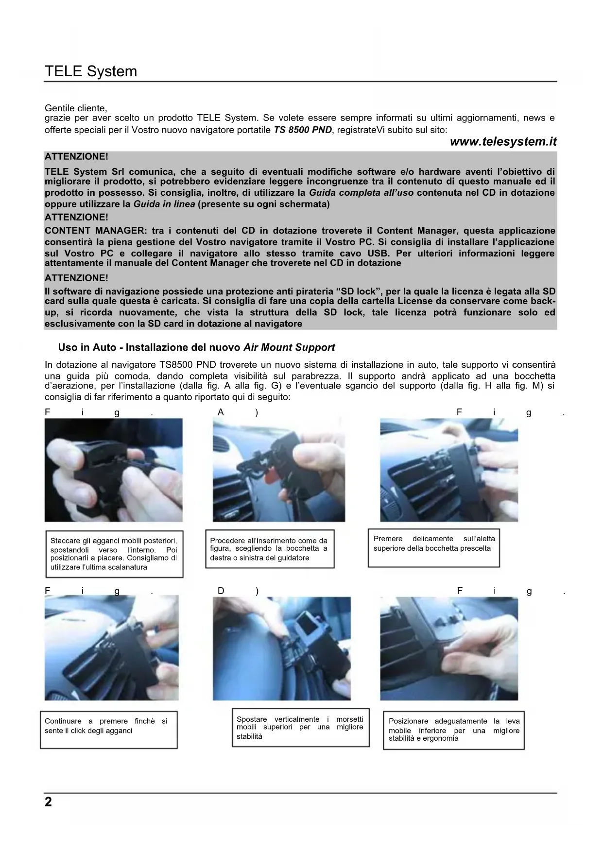 - TELESystem non risponde di nessun eventuale danno causato dall'utente nell'installazione e disinstallazione del TS8500 PND sul veicolo