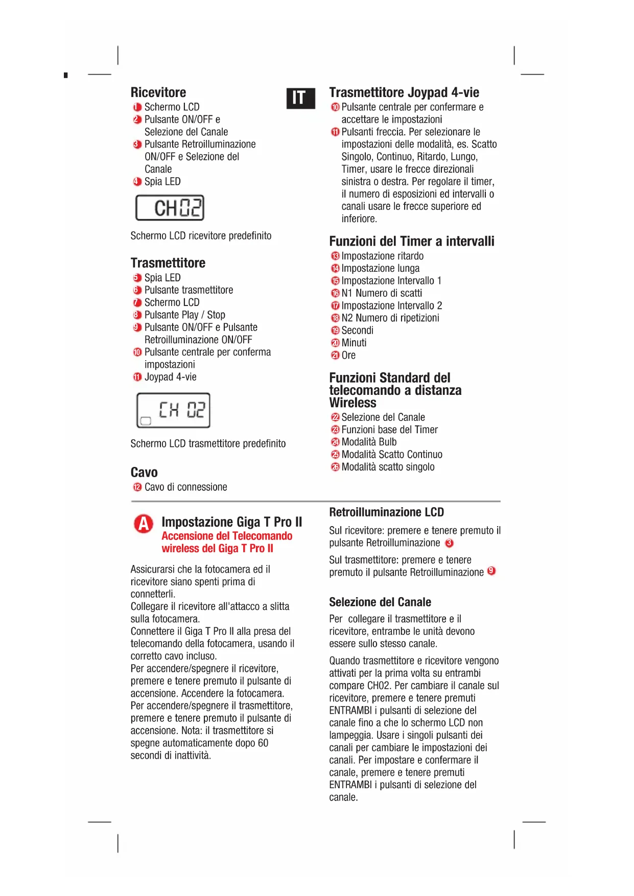 ITPer cambiare canale sul trasmettitore, usare il Joypad per andare su modalità Selezione del Canale e premere il pulsante centrale per confermare. Regolare usando il Joypad, impostare e confermare usando il pulsante centrale. Per ulteriori canali e caratteristiche vedere “FAQ's” Funzioni Standard del Telecomando Wireless Modalità scatto singolo Assicurarsi che la fotocamera sia in modalità scatto singolo. Fare riferimento al manuale della fotocamera. Usando il Joypad, posizionare il trasmettitore in modalità scatto singolo. Per operare con la messa a fuoco automatica assicurarsi che la fotocamera sia abilitata all'autofocus. Premere a metà il pulsante del trasmettitore. La luce verde sul trasmettitore e sul ricevitore indica che l'autofocus è attivo. Per attivare lo scatto premere completamente il pulsante del trasmettitore. La luce rossa sul trasmettitore e sul ricevitore indica che è stato effettuato uno scatto singolo. Modalità a scatto continuo Assicurarsi che la fotocamera sia in modalità scatto continuo. Premere a metà il pulsante del trasmettitore per operare con l'autofocus. Premere completamente a tenere premuto il pulsante trasmettitore. La fotocamera continuerà a scattare per tutto il tempo in cui il pulsante trasmettitore sarà premuto. Modalità Bulb - Lunghe esposizioni Assicurarsi che la fotocamera sia in modalità Bulb. Posizionare il trasmettitore in modalità Bulb. Premere a metà il pulsante trasmettitore per operare con autofocus. Premere completamente il pulsante del trasmettitore per aprire l'otturatore. Sul display comparirà il tempo progressivo della sua apertura. Premere il pulsante di nuovo per chiudere l'otturatore. Funzione Base del Timer Impostazione di uno specifico numero di scatti e di uno specifico tempo di attesa prima di fare il primo scatto. Assicurarsi che la fotocamera sia in modalità scatto singolo. Impostare il trasmettitore in Modalità Base del Timer. Premere il pulsante centrale. Usare il Joypad per selezionare il numero di scatti e successivamente, il tempo di attesa per il primo scatto. Premere il pulsante centrale per confermare e salvare le impostazioni. Premere a metà il pulsante del trasmettitore. Premere completamente il pulsante Trasmettitore. L'autofocus si inserirà tra gli scatti. Fare riferimento alla sezione “FAQ” per disattivare l'autofocus. Funzioni programmabili del Timer regolatore degli intervalli Per programmare il timer degli intervalli del Giga T Pro II impostare i parametri del “Programma Base” inserendo i valori di ogni parametro: Ritardo, Lungo, Intervallo 1, N1. Per impostare le ripetizioni del “Programma Base”, impostare i valori di frequenza e intervallo usando i parametri Intervallo 2 e N2. Le impostazioni della fotocamera influenzano ciascuna delle funzioni. Per serie di scatti singoli temporizzati assicurarsi che la fotocamera sia in modalità scatto singolo. Per scatti continui assicurarsi che la fotocamera è in modalità scatto continuo. Per lunghe esposizioni, assicurarsi che la fotocamera è in modalità “bulb continuo”.