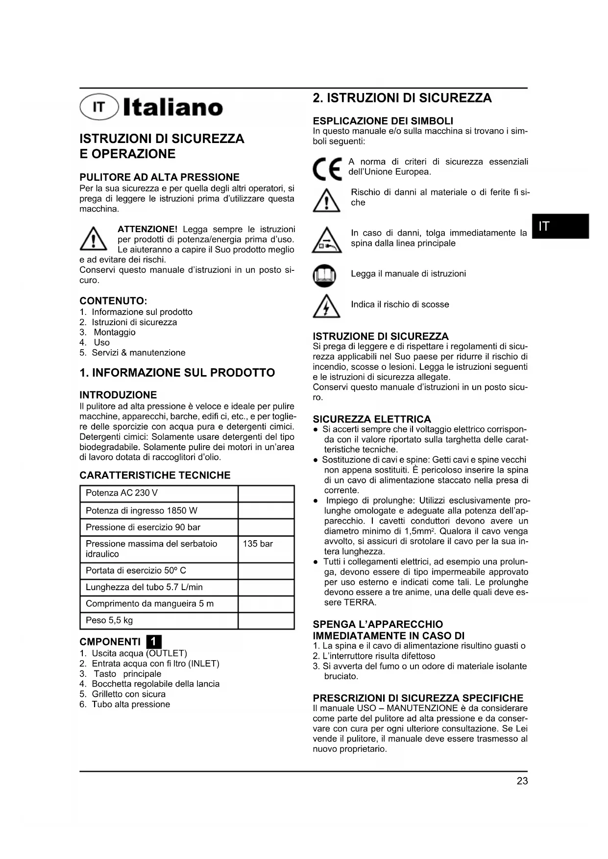 INTRODUZIONE Il pulitore ad alta pressione è veloce e ideale per pulire macchine, apparecchi, barche, edifi ci, etc., e per toglie- re delle sporcizie con acqua pura e detergenti cimici. Detergenti cimici: Solamente usare detergenti del tipo biodegradabile. Solamente pulire dei motori in un’area di lavoro dotata di raccoglitori d’olio. CARATTERISTICHE TECNICHE Potenza AC 230 V Potenza di ingresso 1850 W Pressione di esercizio 90 bar Pressione massima del serbatoio idraulico 135 bar Portata di esercizio 50º C Lunghezza del tubo 5.7 L/min Comprimento da mangueira 5 m Peso 5,5 kg CMPONENTI 1