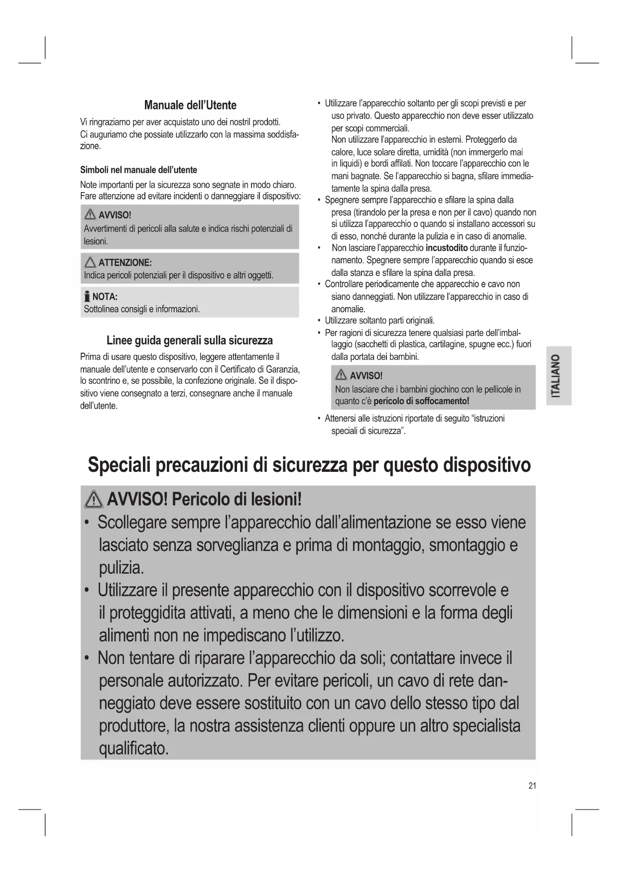 Note importanti per la sicurezza sono segnate in modo chiaro.