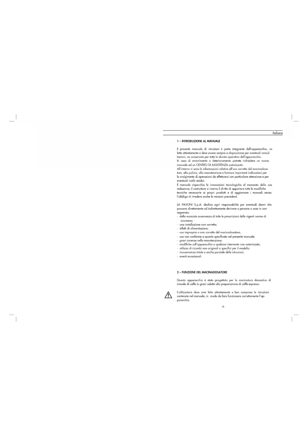 Il presente manuale di istruzioni è parte integrante dell’apparecchio, va letto attentamente e deve essere sempre a disposizione per eventuali consul- tazioni; va conservato per tutta la durata operativa dell’apparecchio. In caso di smarrimento o deterioramento potrete richiedere un nuovo manuale ad un CENTRO DI ASSISTENZA autorizzato. All’interno vi sono le informazioni relative all’uso corretto del macinadosa- tore, alla pulizia, alla manutenzione e fornisce importanti indicazioni per lo svolgimento di operazioni da effettuarsi con particolare attenzione e per eventuali rischi residui. Il manuale rispecchia le innovazioni tecnologiche al momento della sua redazione; il costruttore si riserva il diritto di apportare tutte le modifiche tecniche necessarie ai propri prodotti e di aggiornare i manuali senza l’obbligo di rivedere anche le versioni precedenti. LA PAVONI S.p.A. declina ogni responsabilità per eventuali danni che possano direttamente od indirettamente derivare a persone o cose in con- seguenza: - della mancata osservanza di tutte le prescrizioni delle vigenti norme di sicurezza; - una installazione non corretta; - difetti di alimentazione; - uso improprio o non corretto del macinadosatore; - uso non conforme a quanto specificato nel presente manuale; - gravi carenze nella manutenzione; - modifiche sull’apparecchio o qualsiasi intervento non autorizzato; - utilizzo di ricambi non originali o specifici per il modello; - inosservanza totale o anche parziale delle istruzioni; - eventi eccezionali.