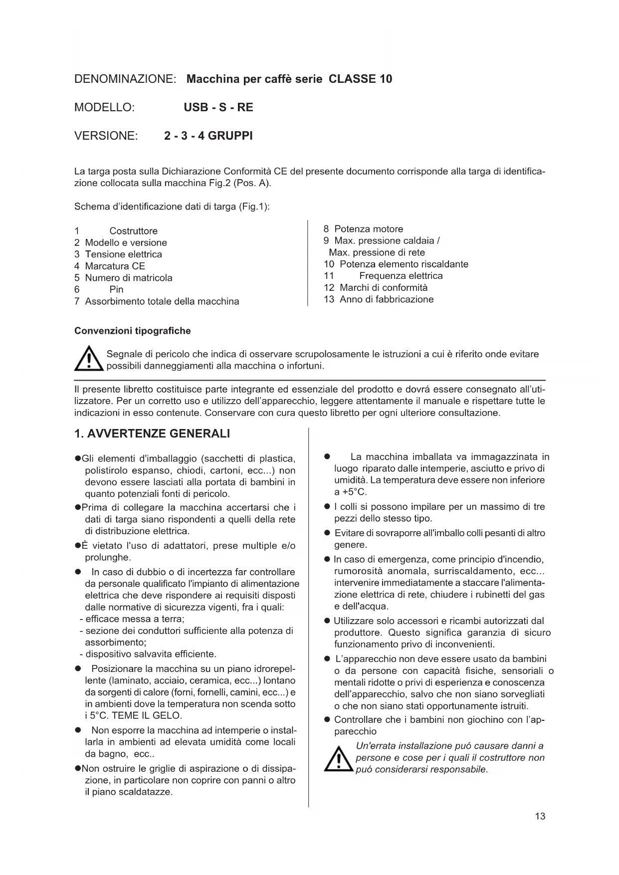 Gli elementi d'imballaggio (sacchetti di plastica, polistirolo espanso, chiodi, cartoni, ecc...) non devono essere lasciati alla portata di bambini in quanto potenziali fonti di pericolo. Prima di collegare la macchina accertarsi che i dati di targa siano rispondenti a quelli della rete di distribuzione elettrica. È vietato l'uso di adattatori, prese multiple e/o prolunghe. In caso di dubbio o di incertezza far controllare da personale qualicato l'impianto di alimentazione elettrica che deve rispondere ai requisiti disposti dalle normative di sicurezza vigenti, fra i quali: - efcace messa a terra; - sezione dei conduttori sufciente alla potenza di assorbimento; - dispositivo salvavita efciente. Posizionare la macchina su un piano idrorepel- lente (laminato, acciaio, ceramica, ecc...) lontano da sorgenti di calore (forni, fornelli, camini, ecc...) e in ambienti dove la temperatura non scenda sotto i 5°C. TEME IL GELO. Non esporre la macchina ad intemperie o instal- larla in ambienti ad elevata umidità come locali da bagno, ecc.. Non ostruire le griglie di aspirazione o di dissipa- zione, in particolare non coprire con panni o altro il piano scaldatazze. Convenzioni tipograche Segnale di pericolo che indica di osservare scrupolosamente le istruzioni a cui è riferito onde evitare possibili danneggiamenti alla macchina o infortuni. Il presente libretto costituisce parte integrante ed essenziale del prodotto e dovrá essere consegnato all’uti- lizzatore. Per un corretto uso e utilizzo dell’apparecchio, leggere attentamente il manuale e rispettare tutte le indicazioni in esso contenute. Conservare con cura questo libretto per ogni ulteriore consultazione. 1 Costruttore 2 Modello e versione 3 Tensione elettrica 4 Marcatura CE 5 Numero di matricola 6 Pin 7 Assorbimento totale della macchina 8 Potenza motore 9 Max. pressione caldaia / Max. pressione di rete 10 Potenza elemento riscaldante 11 Frequenza elettrica 12 Marchi di conformità 13 Anno di fabbricazione14