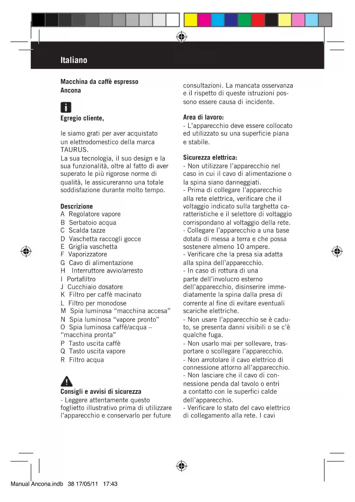 Ancona - Macchina da caffè TAURUS - Manuale utente e istruzioni gratuiti