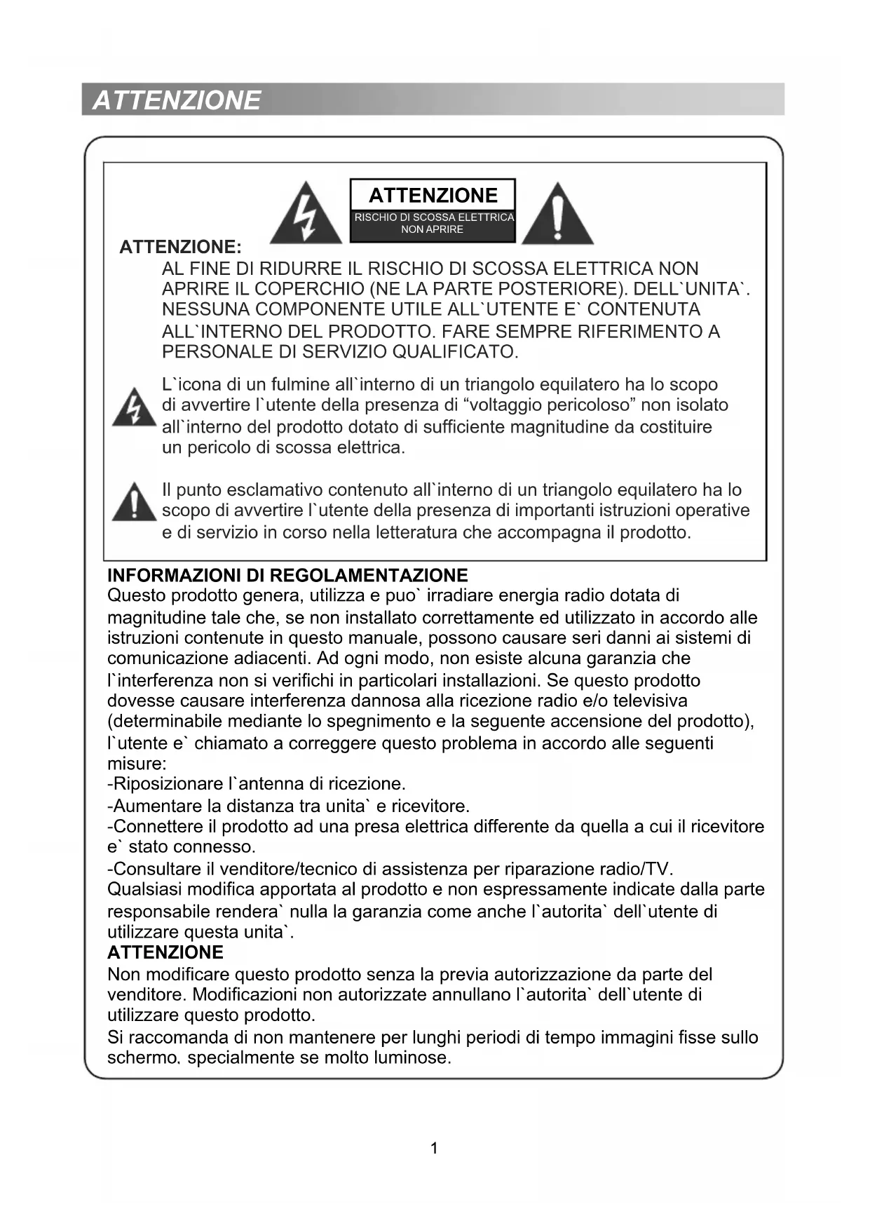 NON APRIRE 1ATTENZIONE ATTENZIONE Al fine di ridurre il rischio di esposizione a scossa elettrica, non esporre questo prodotto alla pioggia oppure all`umidita`. Non utilizzare questo apparato in climi tropicali. La ventilazione non deve essere impedita coprendo le prese d`aria con oggetti come giornali, tende, tappeti, ecc… Questo prodotto non deve essere esposto a gocciolio o spruzzi, nessun oggetto contenente liquidi (vasi) deve essere posizionato al di sopra dell`apparecchio. Prestare la massima attenzione nel seguire le disposizioni locali per la disposizione delle batterie. Non gettare le batterie assieme alla spazzatura domestica. Prego contattare il venditore per ulteriori informazioni. Una distanza minima (5cm) attorno al prodotto deve essere assicurata per una ventilazione adeguataDŽ Posizionare il prodotto lontano da fonti di calore e da fiamme vive. Al fine di prevenire incendi, tenere candele ed altre fiamme vive lontano dal prodotto. ATTENZIONE Connessione del cavo elettrico La maggior parte degli elettrodomestici possono essere posizionati su circuiti speciali, come per esempio prese a circuito singolo senza l`aggiunta di prese multiple. No sovraccaricare la presa elettrica, non allentare o danneggiare prese a muro, cavi elettrici o spine. Non seguire queste indicazioni potrebbe determinare scossa elettrica o incendio. Esaminare periodicamente il cavo elettrico al fine di individuare danni, deterioramento. Nel caso di difetto, interromperne l`uso e fare riferimento al centro di servizio autorizzato. Evitare di torcere il cavo elettrico, posizionarlo in aree dove non costituisca un intralcio al passaggio. Prestare la massima attenzione alla condizione d`uso delle prese elttriche. Le prese principali devono rimanere sempre utilizzabili. L’attrezzatura puo’ essere male funzionata quando sotto scarica elettrostastica. Puo’ essere ripresa manualmente da accendere e spegnare di nuovo,