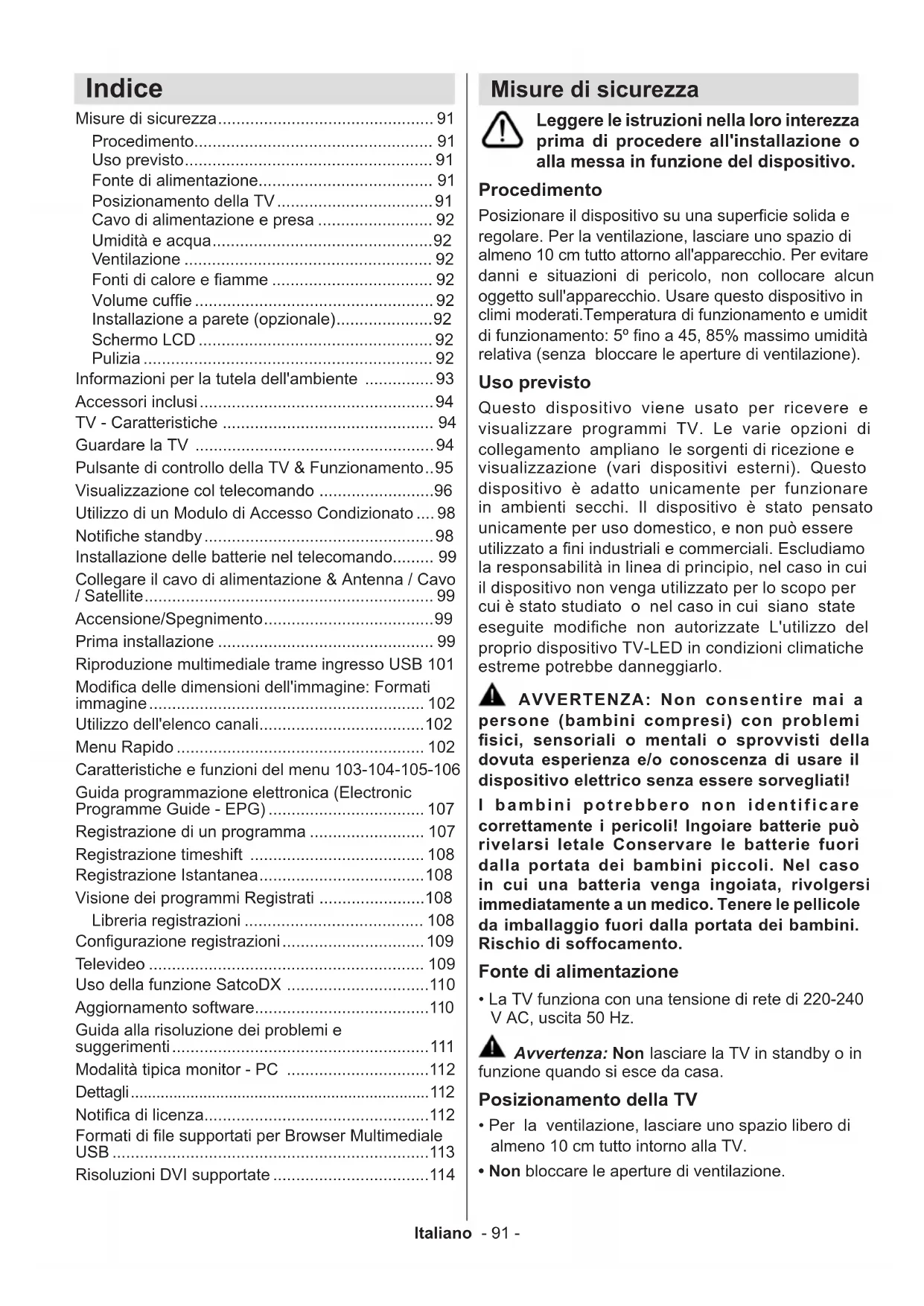 - Non bloccare le aperture di ventilazione. Indice Misure di sicurezza ............................................... 91 Procedimento.................................................... 91 Uso previsto ...................................................... 91 Fonte di alimentazione...................................... 91 Posizionamento della TV .................................. 91 Cavo di alimentazione e presa ......................... 92 Umidità e acqua ................................................ 92 Ventilazione ...................................................... 92 Fonti di calore e amme ................................... 92 Volume cufe .................................................... 92 Installazione a parete (opzionale) ..................... 92 Schermo LCD ................................................... 92 Pulizia ............................................................... 92 Informazioni per la tutela dell'ambiente ............... 93 Accessori inclusi ................................................... 94 TV - Caratteristiche .............................................. 94 Guardare la TV .................................................... 94 Pulsante di controllo della TV & Funzionamento .. 95 Visualizzazione col telecomando ......................... 96 Utilizzo di un Modulo di Accesso Condizionato .... 98 Notiche standby .................................................. 98 Installazione delle batterie nel telecomando......... 99 Collegare il cavo di alimentazione & Antenna / Cavo / Satellite ............................................................... 99 Accensione/Spegnimento ..................................... 99 Prima installazione ............................................... 99 Riproduzione multimediale trame ingresso USB 101 Modica delle dimensioni dell'immagine: Formati immagine ............................................................ 102 Utilizzo dell'elenco canali .................................... 102 Menu Rapido ...................................................... 102 Caratteristiche e funzioni del menu 103-104-105-106 Guida programmazione elettronica (Electronic Programme Guide - EPG) .................................. 107 Registrazione di un programma ......................... 107 Registrazione timeshift ...................................... 108 Registrazione Istantanea .................................... 108 Visione dei programmi Registrati ....................... 108 Libreria registrazioni ....................................... 108 Congurazione registrazioni ............................... 109 Televideo ............................................................ 109 Uso della funzione SatcoDX ...............................110 Aggiornamento software......................................110 Guida alla risoluzione dei problemi e suggerimenti ........................................................111 Modalità tipica monitor - PC ...............................112 Dettagli ......................................................................112 Notica di licenza.................................................112 Formati di le supportati per Browser Multimediale USB .....................................................................113 Risoluzioni DVI supportate ..................................114Italiano - 92 -