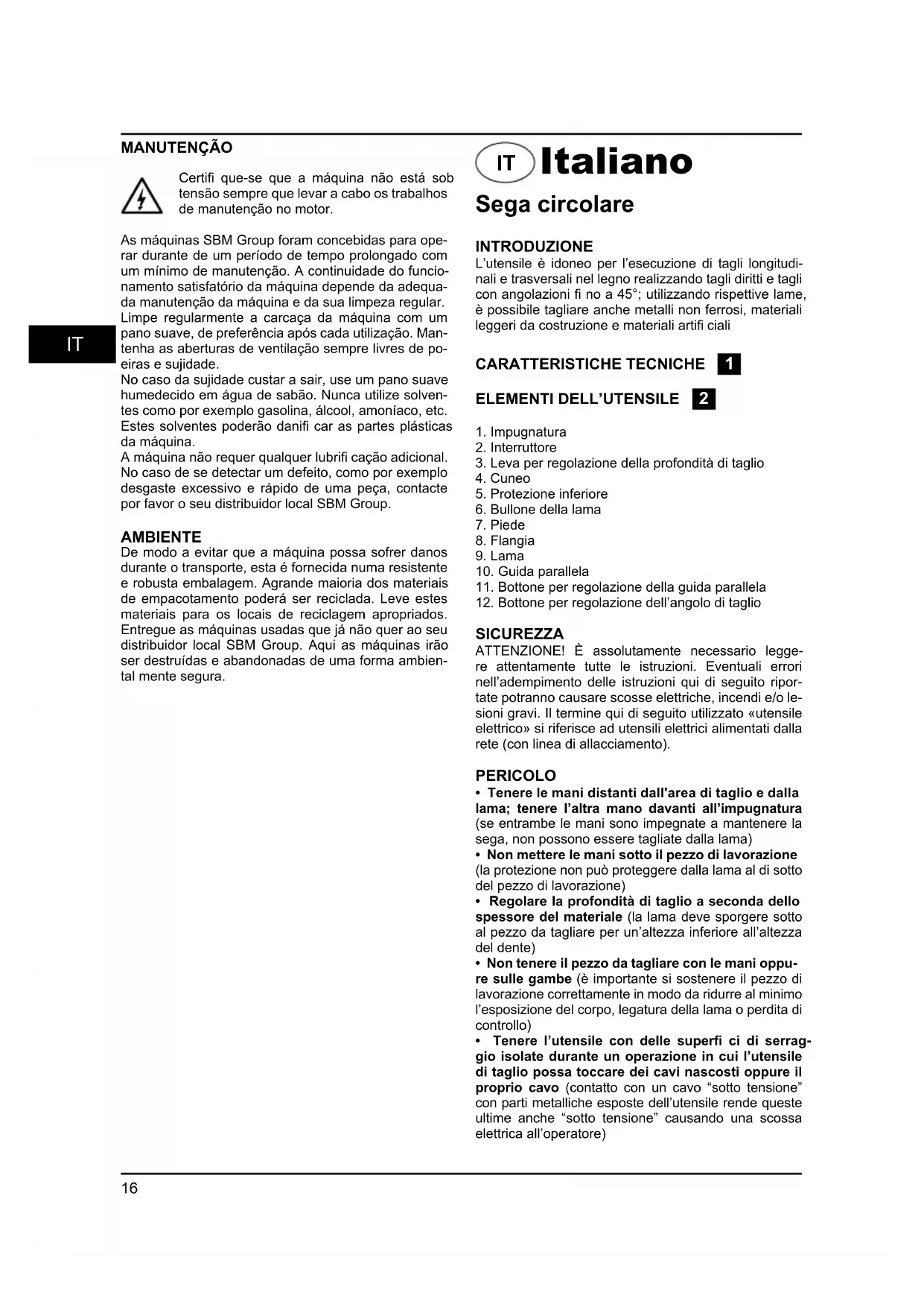 Sega circolare INTRODUZIONEL’utensile è idoneo per l’esecuzione di tagli longitudi-nali e trasversali nel legno realizzando tagli diritti e tagli con angolazioni fi no a 45°; utilizzando rispettive lame, è possibile tagliare anche metalli non ferrosi, materiali leggeri da costruzione e materiali artifi cialiCARATTERISTICHE TECNICHE 1 ELEMENTI DELL’UTENSILE 2 1. Impugnatura2. Interruttore3. Leva per regolazione della profondità di taglio4. Cuneo5. Protezione inferiore6. Bullone della lama7. Piede8. Flangia9. Lama10. Guida parallela11. Bottone per regolazione della guida parallela12. Bottone per regolazione dell’angolo di taglioSICUREZZAATTENZIONE! È assolutamente necessario legge-re attentamente tutte le istruzioni. Eventuali errori nell’adempimento delle istruzioni qui di seguito ripor-tate potranno causare scosse elettriche, incendi e/o le-sioni gravi. Il termine qui di seguito utilizzato «utensile elettrico» si riferisce ad utensili elettrici alimentati dalla rete (con linea di allacciamento). PERICOLO• Tenere le mani distanti dall'area di taglio e dalla lama; tenere l’altra mano davanti all’impugnatura (se entrambe le mani sono impegnate a mantenere la sega, non possono essere tagliate dalla lama)• Non mettere le mani sotto il pezzo di lavorazione (la protezione non può proteggere dalla lama al di sotto del pezzo di lavorazione)• Regolare la profondità di taglio a seconda dello spessore del materiale (la lama deve sporgere sotto al pezzo da tagliare per un’altezza inferiore all’altezza del dente)• Non tenere il pezzo da tagliare con le mani oppu-re sulle gambe (è importante si sostenere il pezzo di lavorazione correttamente in modo da ridurre al minimo l’esposizione del corpo, legatura della lama o perdita di controllo)• Tenere l’utensile con delle superfi ci di serrag-gio isolate durante un operazione in cui l’utensile di taglio possa toccare dei cavi nascosti oppure il proprio cavo (contatto con un cavo “sotto tensione” con parti metalliche esposte dell’utensile rende queste ultime anche “sotto tensione” causando una scossa elettrica all’operatore)MANUTENÇÃOCertifi que-se que a máquina não está sob tensão sempre que levar a cabo os trabalhos de manutenção no motor.As máquinas SBM Group foram concebidas para ope-rar durante de um período de tempo prolongado com um mínimo de manutenção. A continuidade do funcio-namento satisfatório da máquina depende da adequa-da manutenção da máquina e da sua limpeza regular.Limpe regularmente a carcaça da máquina com um pano suave, de preferência após cada utilização. Man-tenha as aberturas de ventilação sempre livres de po-eiras e sujidade.No caso da sujidade custar a sair, use um pano suave humedecido em água de sabão. Nunca utilize solven-tes como por exemplo gasolina, álcool, amoníaco, etc. Estes solventes poderão danifi car as partes plásticas da máquina.A máquina não requer qualquer lubrifi cação adicional.No caso de se detectar um defeito, como por exemplo desgaste excessivo e rápido de uma peça, contacte por favor o seu distribuidor local SBM Group.AMBIENTEDe modo a evitar que a máquina possa sofrer danos durante o transporte, esta é fornecida numa resistente e robusta embalagem. Agrande maioria dos materiais de empacotamento poderá ser reciclada. Leve estes materiais para os locais de reciclagem apropriados. Entregue as máquinas usadas que já não quer ao seu distribuidor local SBM Group. Aqui as máquinas irão ser destruídas e abandonadas de uma forma ambien-tal mente segura.