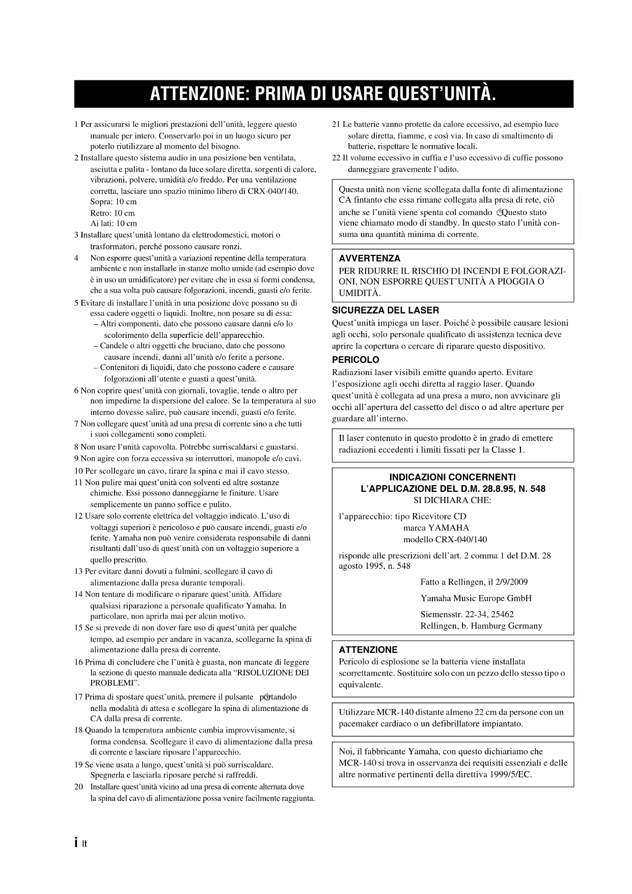SI DICHIARA CHE: l’apparecchio: tipo Ricevitore CD marca YAMAHA modello CRX-040/140 risponde alle prescrizioni dell’art. 2 comma 1 del D.M. 28 agosto 1995, n. 548 Fatto a Rellingen, il 2/9/2009 Yamaha Music Europe GmbH Siemensstr. 22-34, 25462 Rellingen, b. Hamburg Germany ATTENZIONE Pericolo di esplosione se la batteria viene installata scorrettamente. Sostituire solo con un pezzo dello stesso tipo o equivalente. Utilizzare MCR-140 distante almeno 22 cm da persone con un pacemaker cardiaco o un defibrillatore impiantato. Noi, il fabbricante Yamaha, con questo dichiariamo che MCR-140 si trova in osservanza dei requisiti essenziali e delle altre normative pertinenti della direttiva 1999/5/EC.1 It PREPARAZIONE FUNZIONAMENTO INFORMAZIONI AGGIUNTIVE Italiano COMPONENTI ...................................................... 2