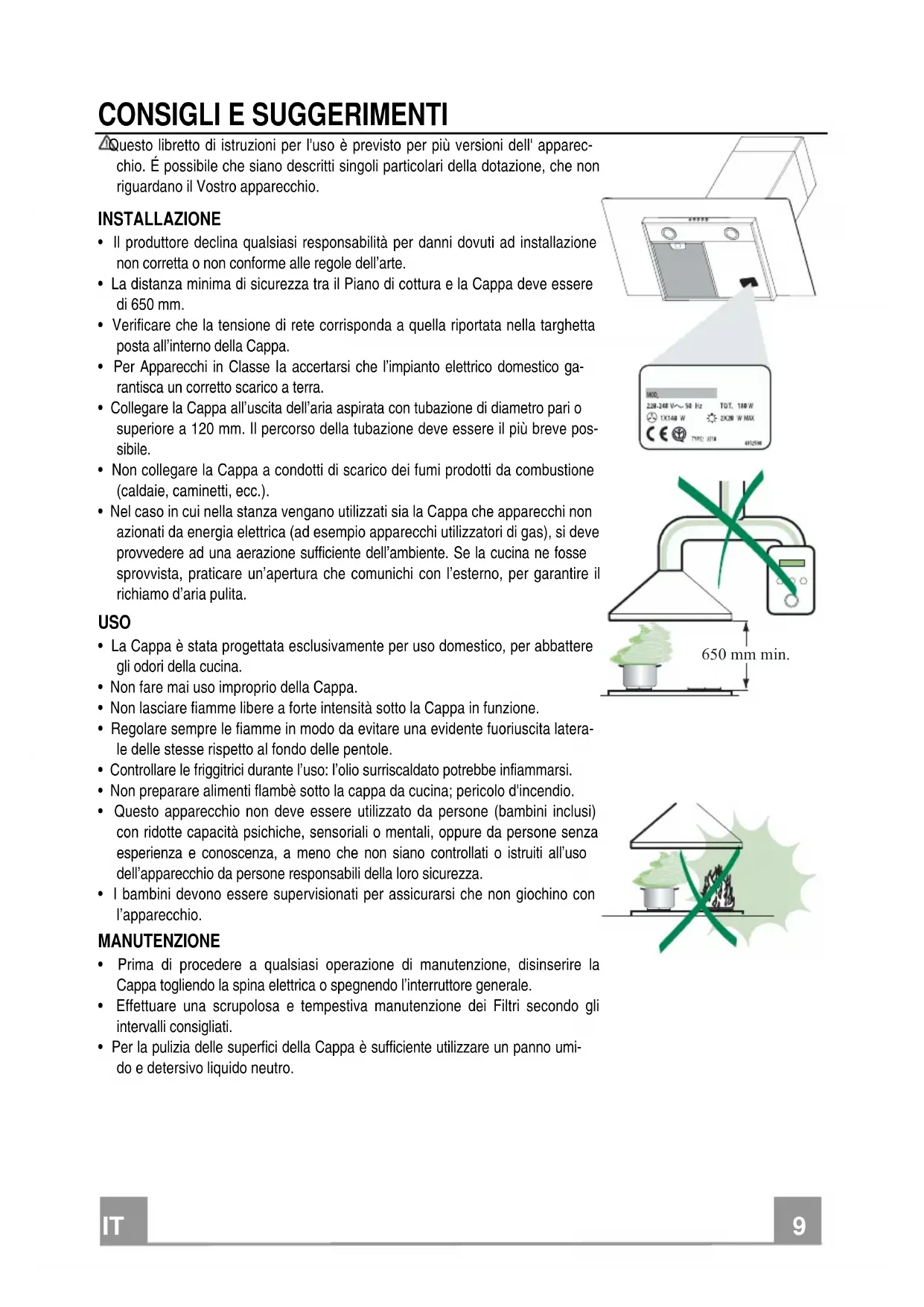 CONSIGLI E SUGGERIMENTI Questo libretto di istruzioni per l'uso è previsto per più versioni dell' apparec-chio. É possibile che siano descritti singoli particolari della dotazione, che non riguardano il Vostro apparecchio. INSTALLAZIONE • Il produttore declina qualsiasi responsabilità per danni dovuti ad installazione non corretta o non conforme alle regole dell’arte. • La distanza minima di sicurezza tra il Piano di cottura e la Cappa deve essere di 650 mm. • Verificare che la tensione di rete corrisponda a quella riportata nella targhetta posta all’interno della Cappa. • Per Apparecchi in Classe Ia accertarsi che l’impianto elettrico domestico ga-rantisca un corretto scarico a terra. • Collegare la Cappa all’uscita dell’aria aspirata con tubazione di diametro pari o superiore a 120 mm. Il percorso della tubazione deve essere il più breve pos-sibile. • Non collegare la Cappa a condotti di scarico dei fumi prodotti da combustione (caldaie, caminetti, ecc.). • Nel caso in cui nella stanza vengano utilizzati sia la Cappa che apparecchi non azionati da energia elettrica (ad esempio apparecchi utilizzatori di gas), si deve provvedere ad una aerazione sufficiente dell’ambiente. Se la cucina ne fosse sprovvista, praticare un’apertura che comunichi con l’esterno, per garantire il richiamo d’aria pulita. USO • La Cappa è stata progettata esclusivamente per uso domestico, per abbattere gli odori della cucina. • Non fare mai uso improprio della Cappa. • Non lasciare fiamme libere a forte intensità sotto la Cappa in funzione. • Regolare sempre le fiamme in modo da evitare una evidente fuoriuscita latera-le delle stesse rispetto al fondo delle pentole. • Controllare le friggitrici durante l’uso: l’olio surriscaldato potrebbe infiammarsi. • Non preparare alimenti flambè sotto la cappa da cucina; pericolo d'incendio. • Questo apparecchio non deve essere utilizzato da persone (bambini inclusi) con ridotte capacità psichiche, sensoriali o mentali, oppure da persone senza esperienza e conoscenza, a meno che non siano controllati o istruiti all’uso dell’apparecchio da persone responsabili della loro sicurezza. • I bambini devono essere supervisionati per assicurarsi che non giochino con l’apparecchio. MANUTENZIONE • Prima di procedere a qualsiasi operazione di manutenzione, disinserire la Cappa togliendo la spina elettrica o spegnendo l’interruttore generale. • Effettuare una scrupolosa e tempestiva manutenzione dei Filtri secondo gli intervalli consigliati. • Per la pulizia delle superfici della Cappa è sufficiente utilizzare un panno umi-do e detersivo liquido neutro.