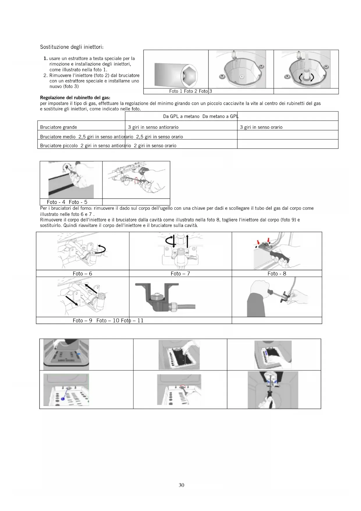per impostare il tipo di gas, effettuare la regolazione del minimo girando con un piccolo cacciavite la vite al centro dei rubinetti del gas e sostuire gli iniettori, come individato nelle foto.