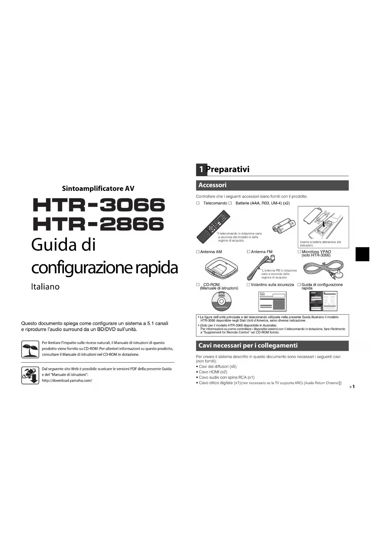 e riprodurre l’audio surround da un BD/DVD sull’unità. Per limitare l’impatto sulle risorse naturali, il Manuale di istruzioni di questo prodotto viene fornito su CD-ROM. Per ulteriori informazioni su questo prodotto, consultare il Manuale di istruzioni nel CD-ROM in dotazione.Dal seguente sito Web è possibile scaricare le versioni PDF della presente Guida e del “Manuale di istruzioni”:http://download.yamaha.com/2 It