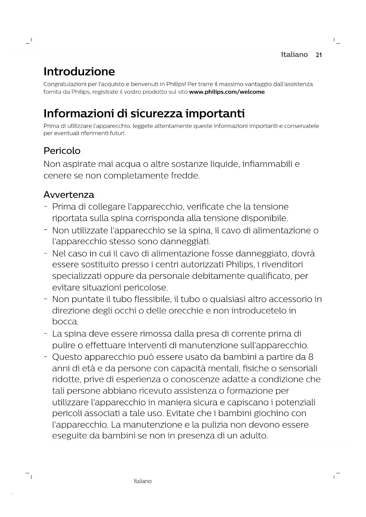 Prima di utilizzare l'apparecchio, leggete attentamente queste informazioni importantie conservatele per eventuali riferimenti futuri. Pericolo