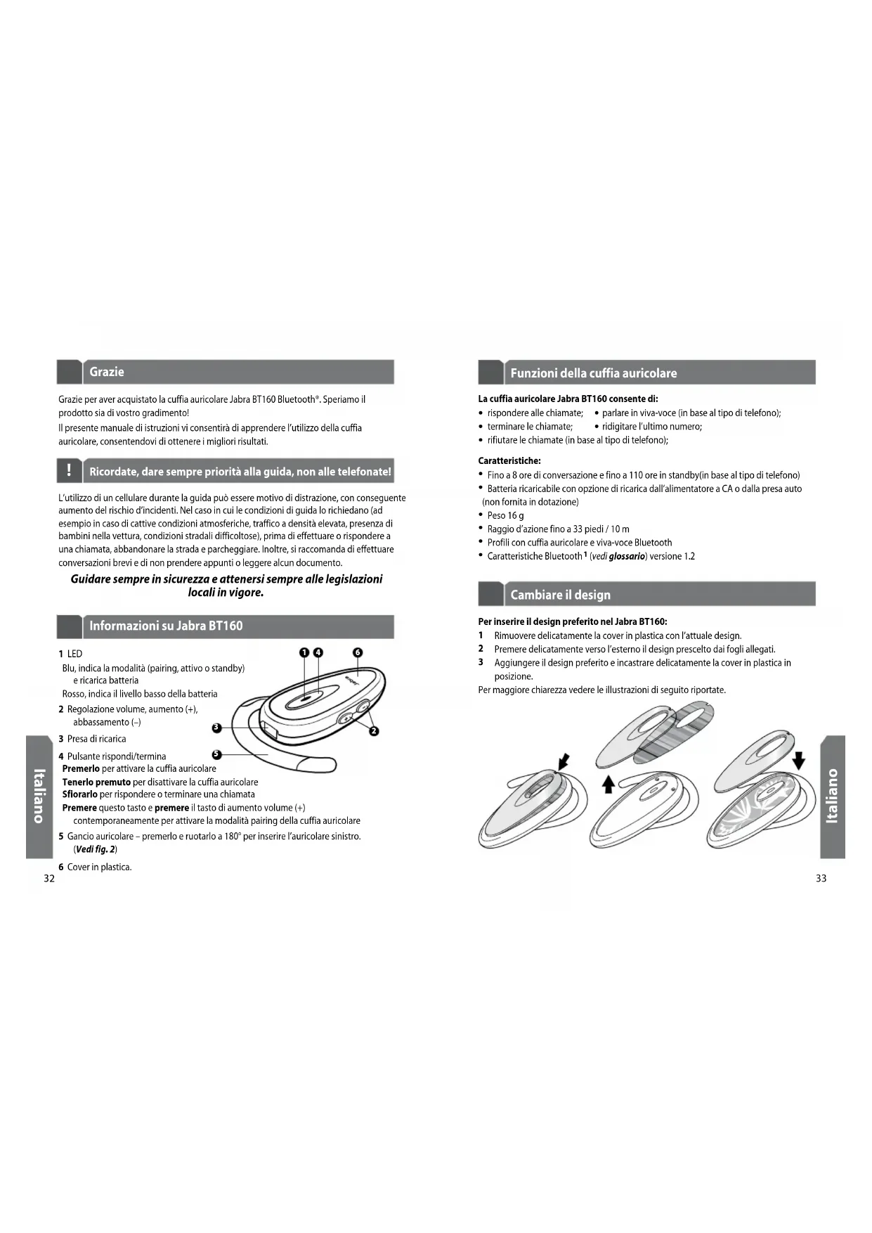 Per inserire il design preferito nel Jabra BT160: 1 Rimuovere delicatamente la cover in plastica con l’attuale design. 2 Premere delicatamente verso l’esterno il design prescelto dai fogli allegati. 3 Aggiungere il design preferito e incastrare delicatamente la cover in plastica in posizione.Per maggiore chiarezza vedere le illustrazioni di seguito riportate.Grazie per aver acquistato la cuffia auricolare Jabra BT160 Bluetooth®. Speriamo il prodotto sia di vostro gradimento! Il presente manuale di istruzioni vi consentirà di apprendere l’utilizzo della cuffia auricolare, consentendovi di ottenere i migliori risultati. Grazie L’utilizzo di un cellulare durante la guida può essere motivo di distrazione, con conseguente aumento del rischio d’incidenti. Nel caso in cui le condizioni di guida lo richiedano (ad esempio in caso di cattive condizioni atmosferiche, traffico a densità elevata, presenza di bambini nella vettura, condizioni stradali difficoltose), prima di effettuare o rispondere a una chiamata, abbandonare la strada e parcheggiare. Inoltre, si raccomanda di effettuare conversazioni brevi e di non prendere appunti o leggere alcun documento. Guidare sempre in sicurezza e attenersi sempre alle legislazioni