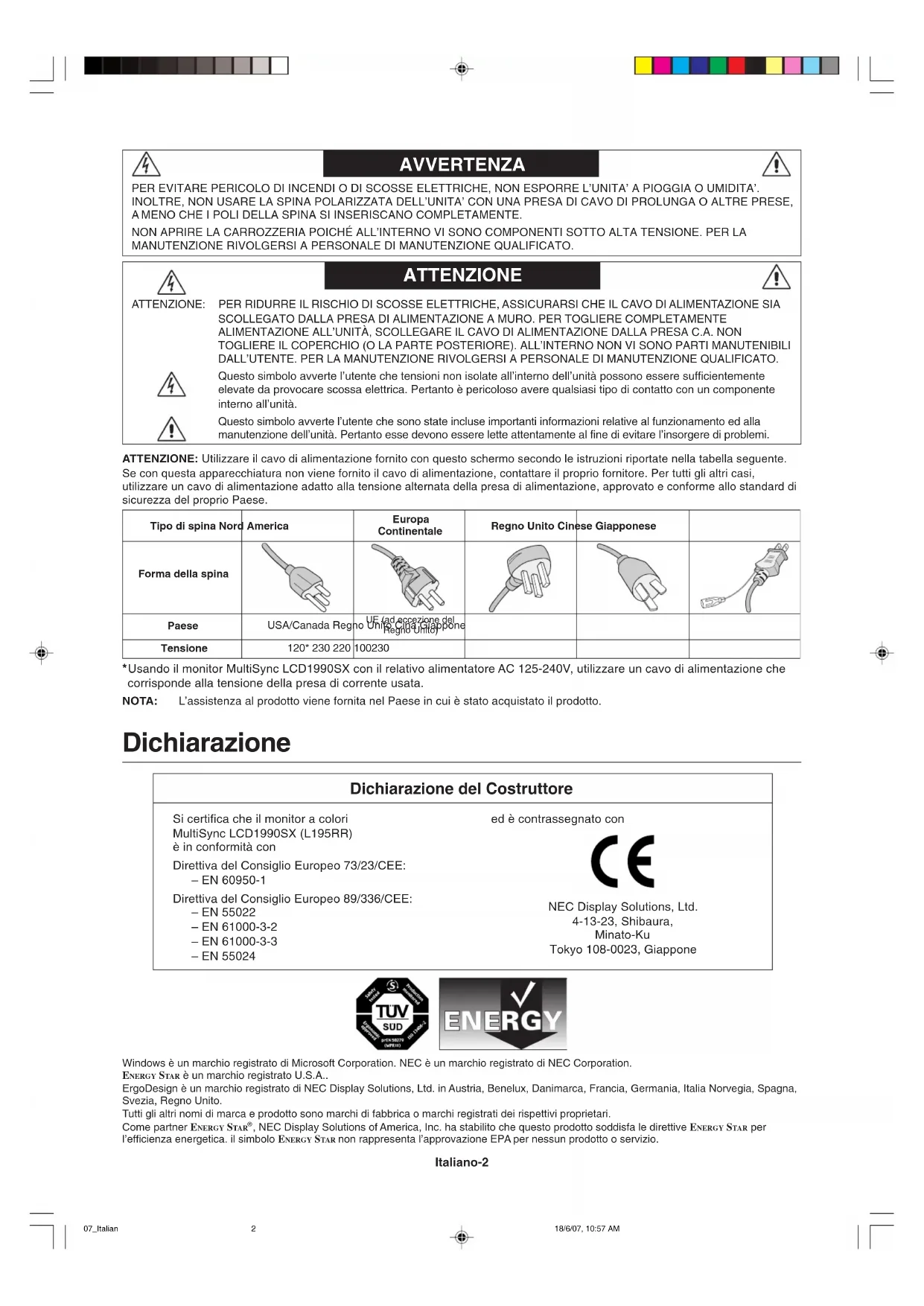 , NEC Display Solutions of America, Inc. ha stabilito che questo prodotto soddisfa le direttive ENERGY STAR per l’efficienza energetica. il simbolo ENERGY STAR non rappresenta l’approvazione EPA per nessun prodotto o servizio. 07_Italian 18/6/07, 10:57 AM2Italiano Italiano-3 Indice La confezione del nuovo monitor NEC* deve contenere i seguenti elementi:
