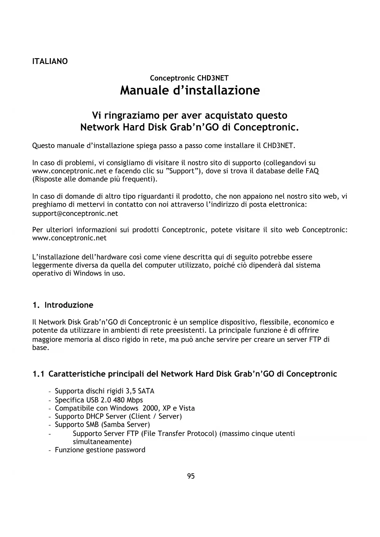 Conceptronic CHD3NET Manuale d’installazione Vi ringraziamo per aver acquistato questo Network Hard Disk Grab’n’GO di Conceptronic. Questo manuale d’installazione spiega passo a passo come installare il CHD3NET. In caso di problemi, vi consigliamo di visitare il nostro sito di supporto (collegandovi su www.conceptronic.net e facendo clic su “Support”), dove si trova il database delle FAQ (Risposte alle domande più frequenti). In caso di domande di altro tipo riguardanti il prodotto, che non appaiono nel nostro sito web, vi preghiamo di mettervi in contatto con noi attraverso l’indirizzo di posta elettronica: support@conceptronic.net Per ulteriori informazioni sui prodotti Conceptronic, potete visitare il sito web Conceptronic: www.conceptronic.net L’installazione dell’hardware così come viene descritta qui di seguito potrebbe essere leggermente diversa da quella del computer utilizzato, poiché ciò dipenderà dal sistema operativo di Windows in uso.