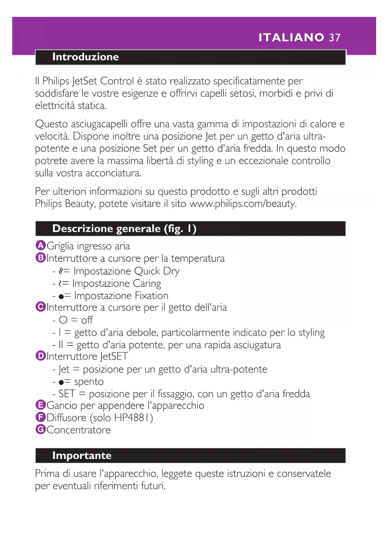 Scarica le istruzioni per il tuo Asciugacapelli in formato PDF gratuitamente! Trova il tuo manuale JetSet Control HP4880 - PHILIPS e riprendi in mano il tuo dispositivo elettronico. In questa pagina sono pubblicati tutti i documenti necessari per l'utilizzo del tuo dispositivo. JetSet Control HP4880 del marchio PHILIPS.