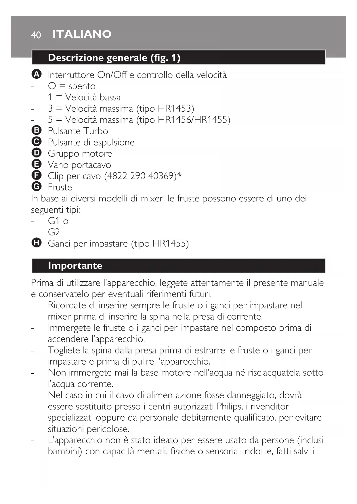 FRANÇAIS 3940 Descrizione generale (g. 1) A Interruttore On/Off e controllo della velocità O = spento 1 = Velocità bassa 3 = Velocità massima (tipo HR1453) 5 = Velocità massima (tipo HR1456/HR1455) B Pulsante Turbo C Pulsante di espulsione D Gruppo motore E Vano portacavo F Clip per cavo (4822 290 40369)* G Fruste In base ai diversi modelli di mixer, le fruste possono essere di uno dei seguenti tipi: G1 o