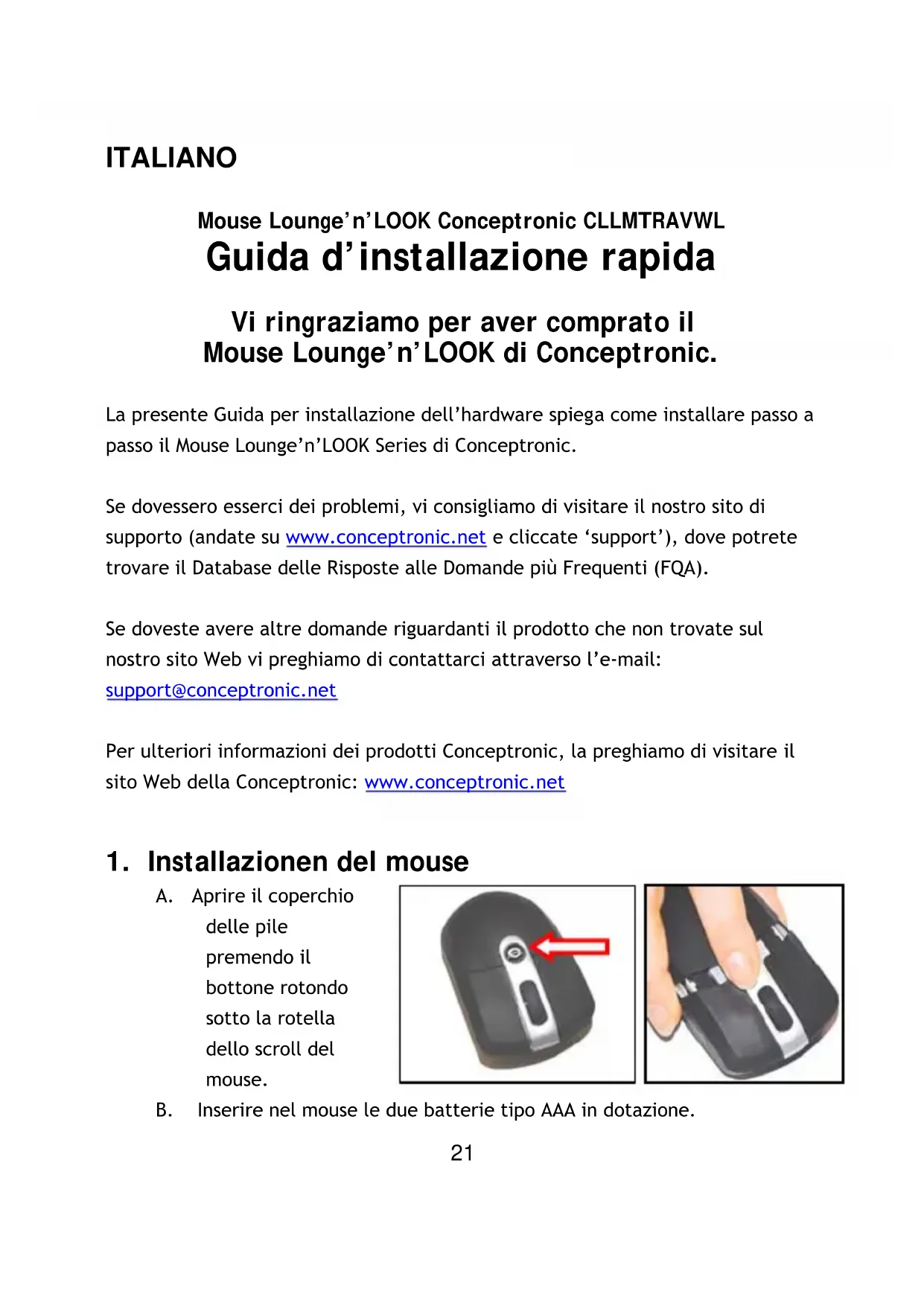 La presente Guida per installazione dell'hardware spiega come installare passo a passo il Mouse Lounge'n'LOOK Series di Conceptronic.