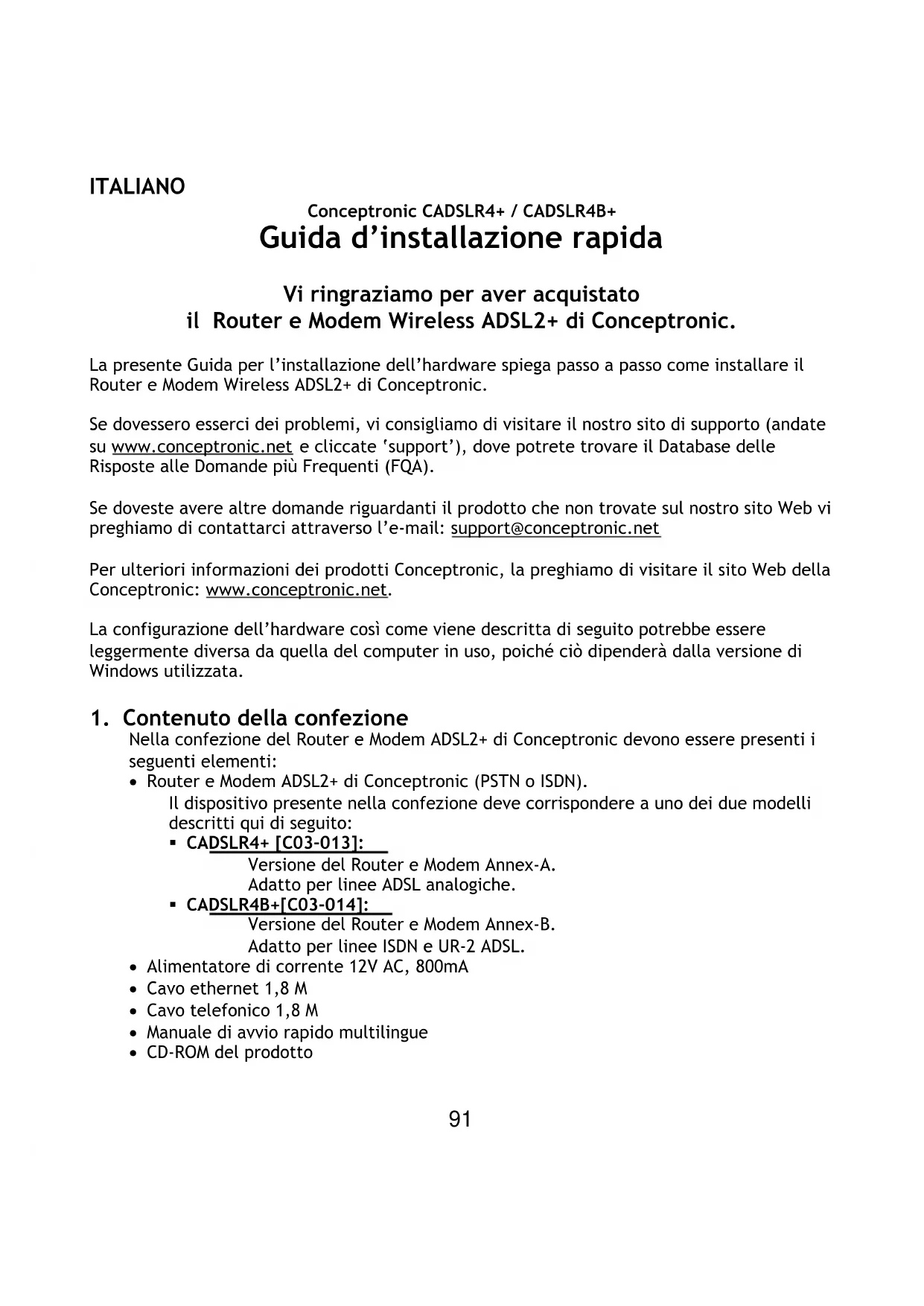 Conceptronic CADSLR4+ / CADSLR4B+ Guida d’installazione rapida Vi ringraziamo per aver acquistato il Router e Modem Wireless ADSL2+ di Conceptronic. La presente Guida per l’installazione dell’hardware spiega passo a passo come installare il Router e Modem Wireless ADSL2+ di Conceptronic. Se dovessero esserci dei problemi, vi consigliamo di visitare il nostro sito di supporto (andate su www.conceptronic.net e cliccate ‘support’), dove potrete trovare il Database delle Risposte alle Domande più Frequenti (FQA). Se doveste avere altre domande riguardanti il prodotto che non trovate sul nostro sito Web vi preghiamo di contattarci attraverso l’e-mail: support@conceptronic.net
