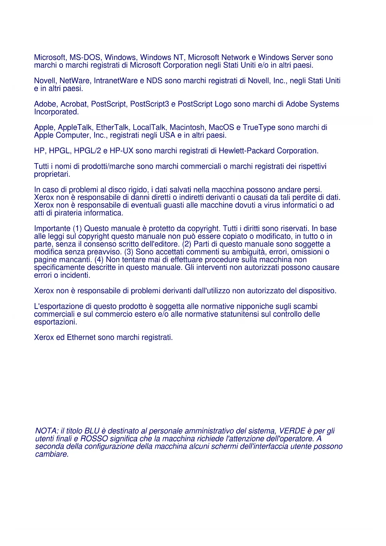 refermer le panneau avant, vérifiez que la cartouche de toner est correctement installée en position verrouillée. Vous savez désormais comment remplacer la cartouche de toner. WorkCentre 7300 Series WorkCentre 7300 Series Guide d'utilisation rapideGuida rapida WorkCentre 7300 Series 701P47986NOTA: il titolo BLU è destinato al personale amministrativo del sistema, VERDE è per gli utenti finali e ROSSO significa che la macchina richiede l'attenzione dell'operatore. A seconda della configurazione della macchina alcuni schermi dell'interfaccia utente possono cambiare. Microsoft, MS-DOS, Windows, Windows NT, Microsoft Network e Windows Server sono marchi o marchi registrati di Microsoft Corporation negli Stati Uniti e/o in altri paesi. Novell, NetWare, IntranetWare e NDS sono marchi registrati di Novell, Inc., negli Stati Uniti e in altri paesi. Adobe, Acrobat, PostScript, PostScript3 e PostScript Logo sono marchi di Adobe Systems Incorporated. Apple, AppleTalk, EtherTalk, LocalTalk, Macintosh, MacOS e TrueType sono marchi di Apple Computer, Inc., registrati negli USA e in altri paesi. HP, HPGL, HPGL/2 e HP-UX sono marchi registrati di Hewlett-Packard Corporation. Tutti i nomi di prodotti/marche sono marchi commerciali o marchi registrati dei rispettivi proprietari. In caso di problemi al disco rigido, i dati salvati nella macchina possono andare persi. Xerox non è responsabile di danni diretti o indiretti derivanti o causati da tali perdite di dati. Xerox non è responsabile di eventuali guasti alle macchine dovuti a virus informatici o ad atti di pirateria informatica. Importante (1) Questo manuale è protetto da copyright. Tutti i diritti sono riservati. In base alle leggi sul copyright questo manuale non può essere copiato o modificato, in tutto o in parte, senza il consenso scritto dell'editore. (2) Parti di questo manuale sono soggette a modifica senza preavviso. (3) Sono accettati commenti su ambiguità, errori, omissioni o pagine mancanti. (4) Non tentare mai di effettuare procedure sulla macchina non specificamente descritte in questo manuale. Gli interventi non autorizzati possono causare errori o incidenti. Xerox non è responsabile di problemi derivanti dall'utilizzo non autorizzato del dispositivo. L'esportazione di questo prodotto è soggetta alle normative nipponiche sugli scambi commerciali e sul commercio estero e/o alle normative statunitensi sul controllo delle esportazioni. Xerox ed Ethernet sono marchi registrati.WorkCentre 7300 Series WorkCentre 7300 Series Guida rapida Sommario Pannello comandi Scansione su home