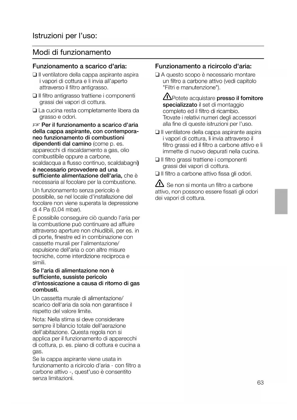 gebruiksaanwijzing).63 Modi di funzionamento Funzionamento a scarico d'aria: ❑ Il ventilatore della cappa aspirante aspira i vapori di cottura e li invia all'aperto attraverso il filtro antigrasso. ❑ Il filtro antigrasso trattiene i componenti grassi dei vapori di cottura. ❑ La cucina resta completamente libera da grasso e odori.