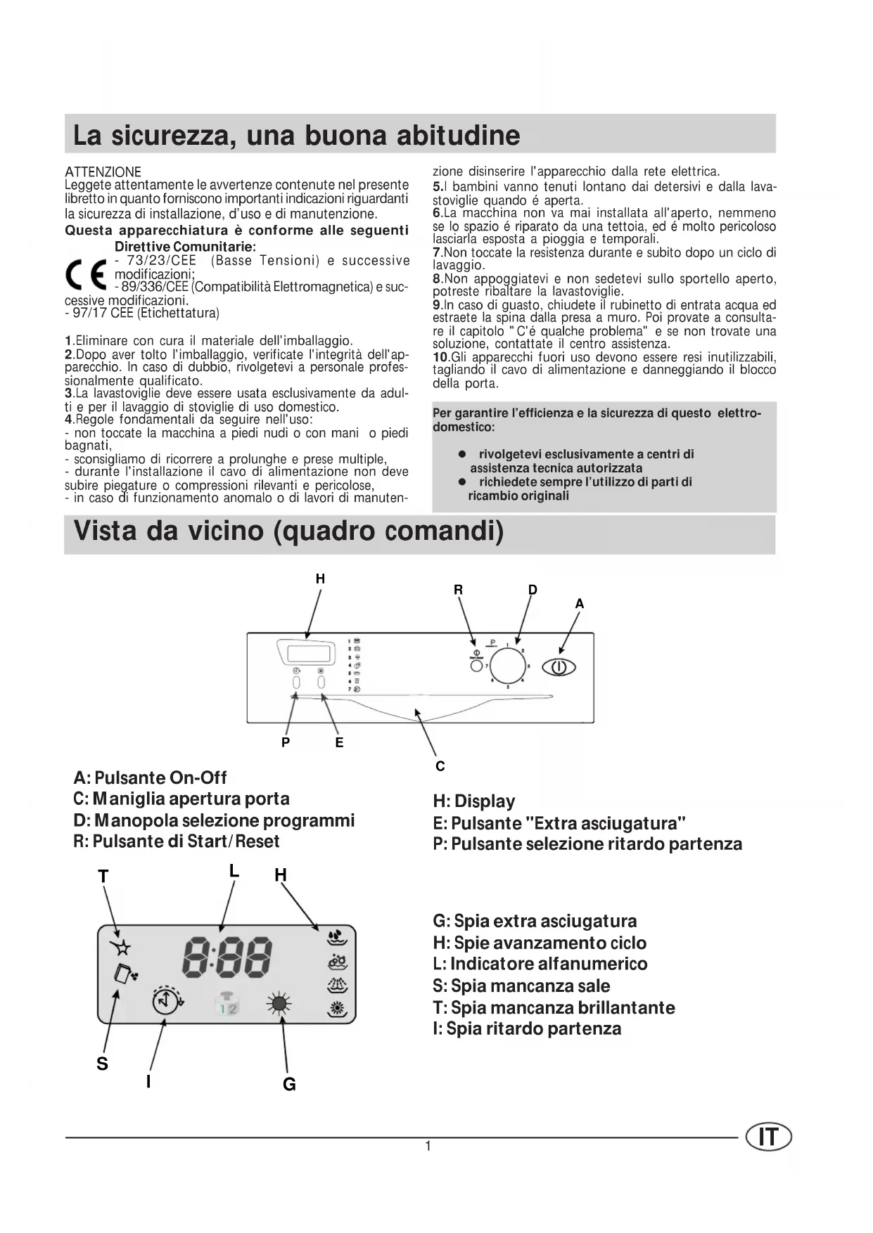 - 97/17 CEE (Etichettatura) 1.Eliminare con cura il materiale dell'imballaggio.2.Dopo aver tolto l'imballaggio, verificate l'integrità dell'ap-parecchio. In caso di dubbio, rivolgetevi a personale profes-sionalmente qualificato.3.La lavastoviglie deve essere usata esclusivamente da adul-ti e per il lavaggio di stoviglie di uso domestico.4.Regole fondamentali da seguire nell'uso:- non toccate la macchina a piedi nudi o con mani o piedibagnati,- sconsigliamo di ricorrere a prolunghe e prese multiple,- durante l'installazione il cavo di alimentazione non devesubire piegature o compressioni rilevanti e pericolose,- in caso di funzionamento anomalo o di lavori di manuten- Vista da vicino (quadro comandi) zione disinserire l'apparecchio dalla rete elettrica.5.I bambini vanno tenuti lontano dai detersivi e dalla lava-stoviglie quando é aperta.6.La macchina non va mai installata all'aperto, nemmenose lo spazio é riparato da una tettoia, ed é molto pericolosolasciarla esposta a pioggia e temporali.7.Non toccate la resistenza durante e subito dopo un ciclo dilavaggio.8.Non appoggiatevi e non sedetevi sullo sportello aperto,potreste ribaltare la lavastoviglie.9.In caso di guasto, chiudete il rubinetto di entrata acqua edestraete la spina dalla presa a muro. Poi provate a consulta-re il capitolo "C'é qualche problema" e se non trovate unasoluzione, contattate il centro assistenza.10.Gli apparecchi fuori uso devono essere resi inutilizzabili,tagliando il cavo di alimentazione e danneggiando il bloccodella porta.Per garantire l’efficienza e la sicurezza di questo elettro-domestico:l rivolgetevi esclusivamente a centri di assistenza tecnica autorizzatal richiedete sempre l’utilizzo di parti di ricambio originali