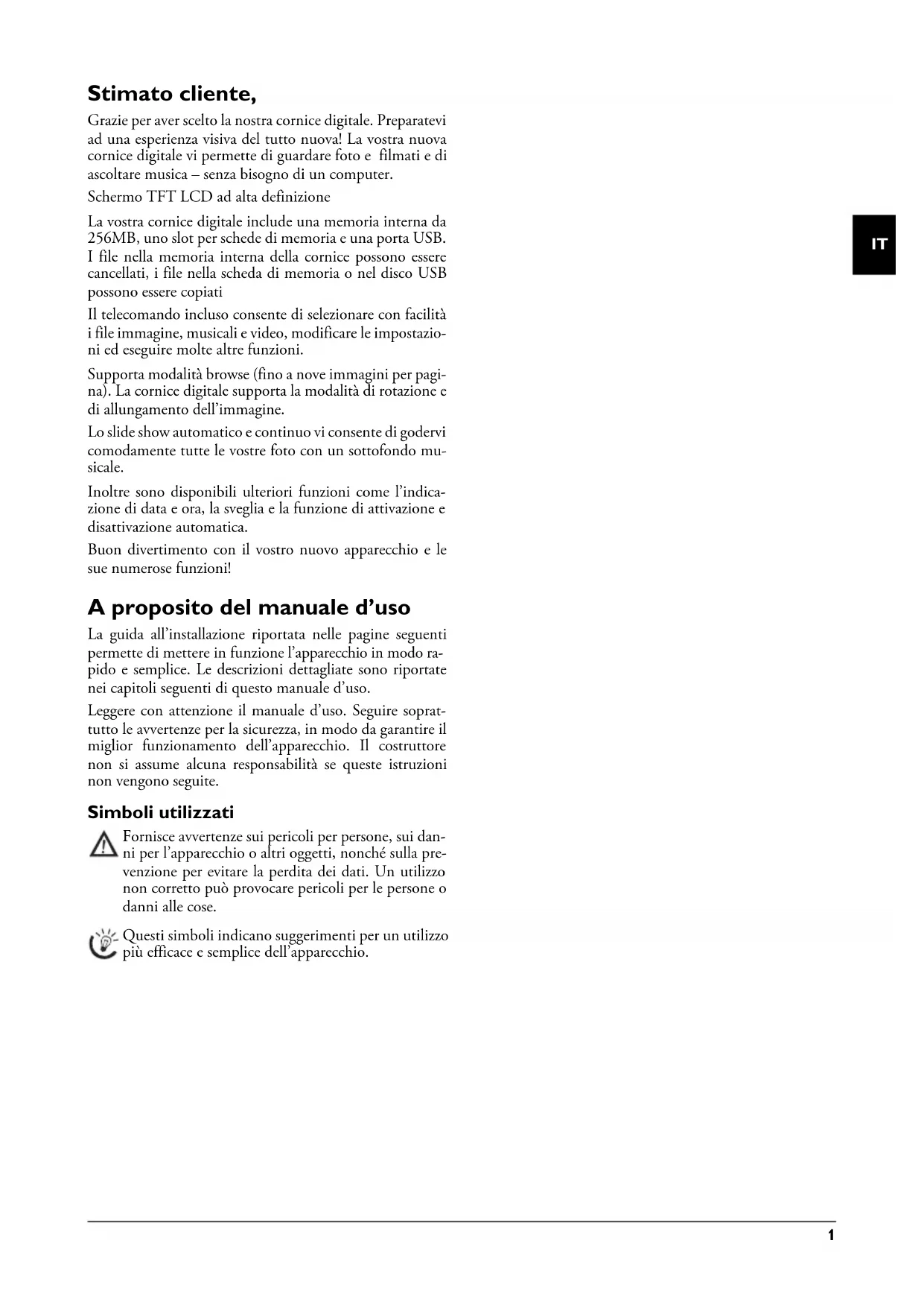 Stimato cliente, Grazie per aver scelto la nostra cornice digitale. Preparatevi ad una esperienza visiva del tutto nuova! La vostra nuova cornice digitale vi permette di guardare foto e filmati e di ascoltare musica – senza bisogno di un computer. Schermo TFT LCD ad alta definizione Memoria La vostra cornice digitale include una memoria interna da 256MB, uno slot per schede di memoria e una porta USB. I file nella memoria interna della cornice possono essere cancellati, i file nella scheda di memoria o nel disco USB possono essere copiati Il telecomando incluso consente di selezionare con facilità i file immagine, musicali e video, modificare le impostazio- ni ed eseguire molte altre funzioni. Supporta modalità browse (fino a nove immagini per pagi- na). La cornice digitale supporta la modalità di rotazione e di allungamento dell’immagine. Lo slide show automatico e continuo vi consente di godervi comodamente tutte le vostre foto con un sottofondo mu- sicale. Inoltre sono disponibili ulteriori funzioni come l’indica- zione di data e ora, la sveglia e la funzione di attivazione e disattivazione automatica. Buon divertimento con il vostro nuovo apparecchio e le sue numerose funzioni! A proposito del manuale d’uso La guida all’installazione riportata nelle pagine seguenti permette di mettere in funzione l’apparecchio in modo ra- pido e semplice. Le descrizioni dettagliate sono riportate nei capitoli seguenti di questo manuale d’uso. Leggere con attenzione il manuale d’uso. Seguire soprat- tutto le avvertenze per la sicurezza, in modo da garantire il miglior funzionamento dell’apparecchio. Il costruttore non si assume alcuna responsabilità se queste istruzioni non vengono seguite. Simboli utilizzati Avvertenza sui pericoliSpiegazione delle indicazioni Fornisce avvertenze sui pericoli per persone, sui dan- ni per l’apparecchio o altri oggetti, nonché sulla pre- venzione per evitare la perdita dei dati. Un utilizzo non corretto può provocare pericoli per le persone o danni alle cose. Questi simboli indicano suggerimenti per un utilizzo più efficace e semplice dell’apparecchio. af-5105_5086_5135ms_manual_it.book Seite 1 Montag, 15. September 2008 10:04 102 AgfaPhoto Digital Photo Frame AF 5086MS · AF 5105MS · AF5135MS