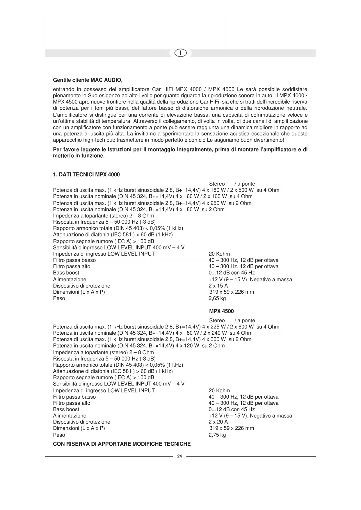 Gentile cliente MAC AUDIO, entrando in possesso dell’amplificatore Car HiFi MPX 4000 / MPX 4500 Le sarà possibile soddisfare pienamente le Sue esigenze ad alto livello per quanto riguarda la riproduzione sonora in auto. Il MPX 4000 / MPX 4500 apre nuove frontiere nella qualità della riproduzione Car HiFi, sia che si tratti dell’incredibile riserva di potenza per i toni più bassi, del fattore basso di distorsione armonica o della riproduzione neutrale. L’amplificatore si distingue per una corrente di elevazione bassa, una capacità di commutazione veloce e un’ottima stabilità di temperatura. Attraverso il collegamento, di volta in volta, di due canali di amplificazione con un amplificatore con funzionamento a ponte può essere raggiunta una dinamica migliore in rapporto ad una potenza di uscita più alta. La invitiamo a sperimentare la sensazione acustica eccezionale che questo apparecchio high-tech può trasmettere in modo perfetto e con ciò Le auguriamo buon divertimento! Per favore leggere le istruzioni per il montaggio integralmente, prima di montare l’amplificatore e di metterlo in funzione.