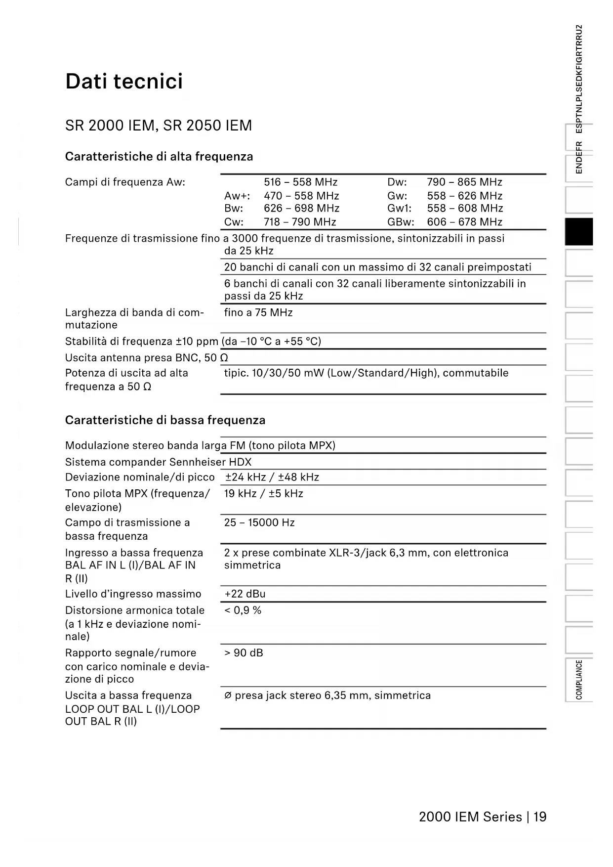 Connettore jack mono 6,3 mm, asimmetrico (Audio In/Loop out) Connettore jack stereo 6,3 mm per collega- mento cuffie EK 2000 IEM Caratteristiche di alta frequenza Modulazione banda larga FM Campi di frequenza Aw: Aw+: Bw: Cw: 516 – 558 MHz 470 – 558 MHz 626 – 698 MHz 718 – 790 MHz Dw: Gw: Gw1: GBw: 790 – 865 MHz 558 – 626 MHz 558 – 608 MHz 606 – 678 MHz Frequenze di ricezione fino a 3000 frequenze di ricezione, sintonizzabili in passi da 25 kHz 20 banchi di canali con ciascuno fino a 32 canali preimpostati 6 banchi di canali con ciascuno fino a 32 canali programmabili Larghezza di banda di com- mutazione fino a 75 MHz Deviazione nominale/di picco ±24 kHz / ±48 kHz Principio di ricezione Adaptive Diversity Sensibilità (con HDX, deviazi- one di picco) < 4 μV, tip. < 1,6 μV per 52 dBA eff S/N Selezione del canale adiacente tip. ≥ 80 dB Attenuazione dell’intermodulazione tip. ≥ 78 dB Blocking ≥ 80 dB2000 IEM Series | 21