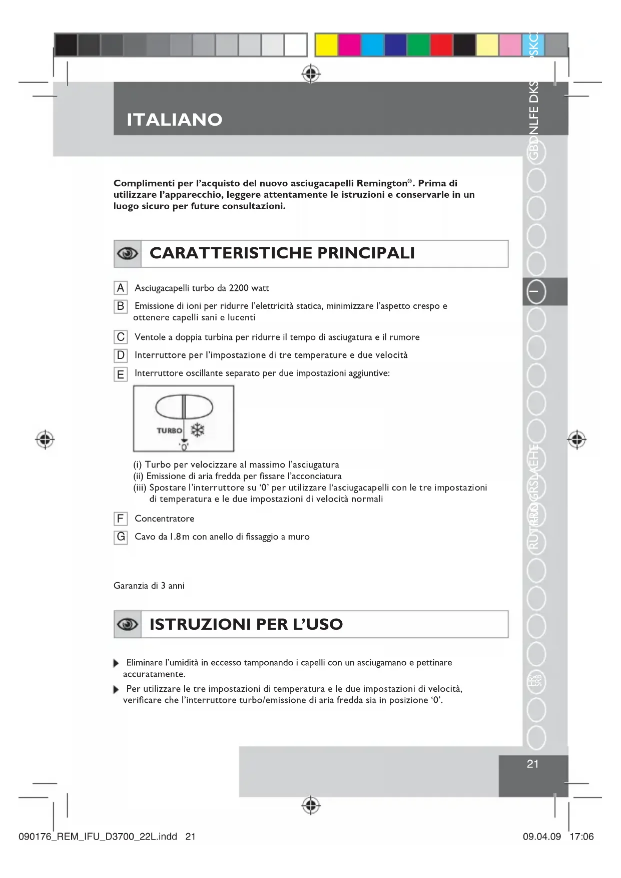 ISTRUZIONI PER L’USO Eliminare l’umidità in eccesso tamponando i capelli con un asciugamano e pettinare accuratamente. Per utilizzare le tre impostazioni di temperatura e le due impostazioni di velocità, verificare che l’interruttore turbo/emissione di aria fredda sia in posizione ‘0’.B5(0B,)8B'B/LQGG 1.8 Garanzia di 3 anniITALIANO