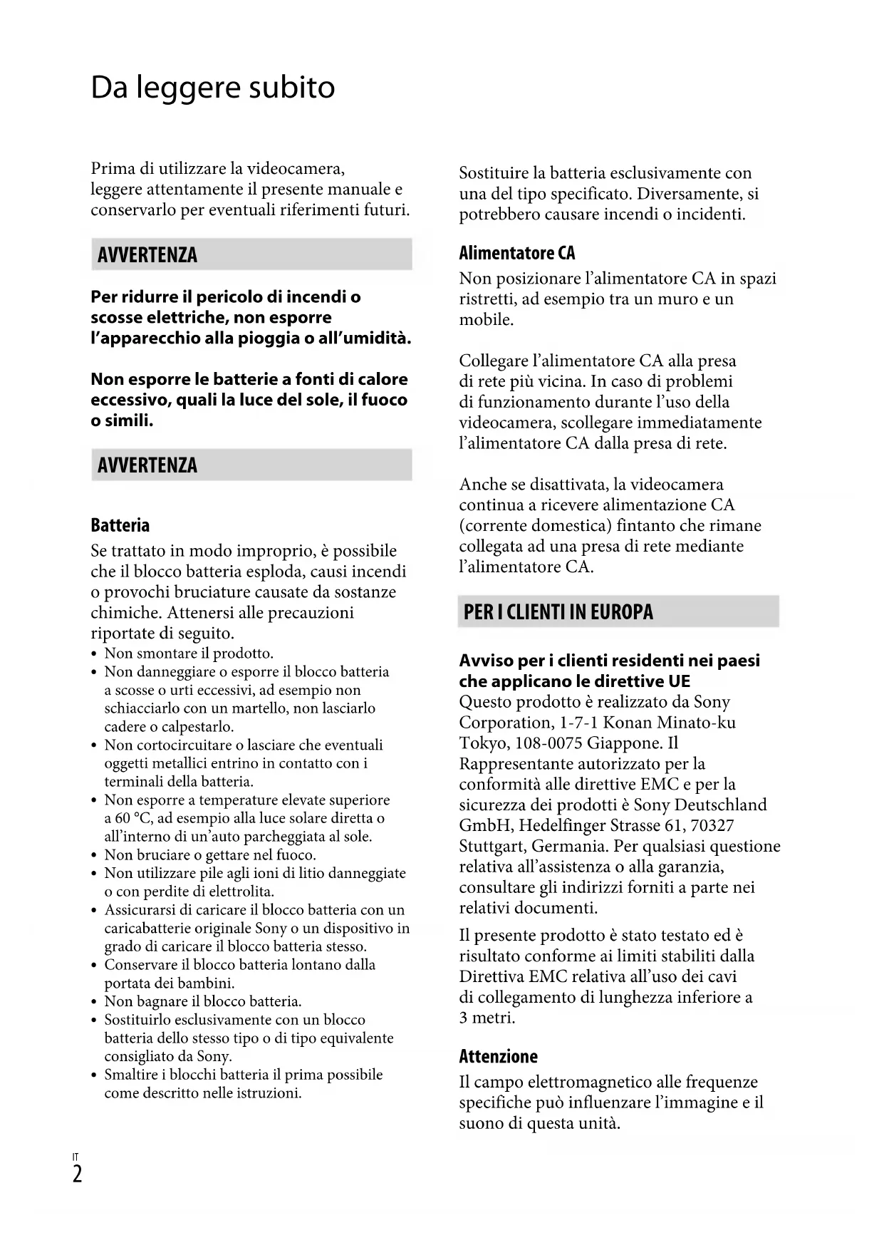 riportate di seguito. Non smontare il prodotto.Non danneggiare o esporre il blocco batteria a scosse o urti eccessivi, ad esempio non schiacciarlo con un martello, non lasciarlo cadere o calpestarlo.Non cortocircuitare o lasciare che eventuali oggetti metallici entrino in contatto con i terminali della batteria.Non esporre a temperature elevate superiore a 60 °C, ad esempio alla luce solare diretta o all’interno di un’auto parcheggiata al sole.Non bruciare o gettare nel fuoco.Non utilizzare pile agli ioni di litio danneggiate o con perdite di elettrolita.Assicurarsi di caricare il blocco batteria con un caricabatterie originale Sony o un dispositivo in grado di caricare il blocco batteria stesso.Conservare il blocco batteria lontano dalla portata dei bambini.Non bagnare il blocco batteria.Sostituirlo esclusivamente con un blocco batteria dello stesso tipo o di tipo equivalente consigliato da Sony.Smaltire i blocchi batteria il prima possibile come descritto nelle istruzioni.