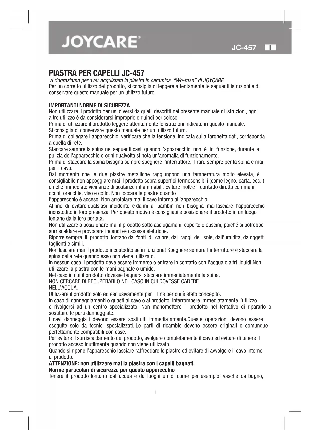 Vi ringraziamo per aver acquistato la piastra in ceramica “Wo-man” di JOYCARE Per un corretto utilizzo del prodotto, si consiglia di leggere attentamente le seguenti istruzioni e di conservare questo manuale per un utilizzo futuro.
