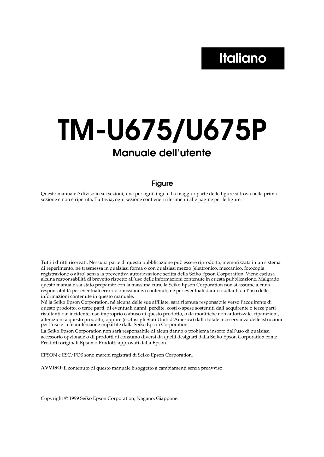 Figure Questo manuale è diviso in sei sezioni, una per ogni lingua. La maggior parte delle figure si trova nella prima sezione e non è ripetuta. Tuttavia, ogni sezione contiene i riferimenti alle pagine per le figure.Tutti i diritti riservati. Nessuna parte di questa pubblicazione può essere riprodotta, memorizzata in un sistema di reperimento, né trasmessa in qualsiasi forma o con qualsiasi mezzo (elettronico, meccanico, fotocopia, registrazione o altro) senza la preventiva autorizzazione scritta della Seiko Epson Corporation. Viene esclusa alcuna responsabilità di brevetto rispetto all’uso delle informazioni contenute in questa pubblicazione. Malgrado questo manuale sia stato preparato con la massima cura, la Seiko Epson Corporation non si assume alcuna responsabilità per eventuali errori o omissioni ivi contenuti, né per eventuali danni risultanti dall’uso delle informazioni contenute in questo manuale.Né la Seiko Epson Corporation, né alcuna delle sue affiliate, sarà ritenuta responsabile verso l’acquirente di questo prodotto, o terze parti, di eventuali danni, perdite, costi o spese sostenuti dall’acquirente o terze parti risultanti da: incidente, uso improprio o abuso di questo prodotto, o da modifiche non autorizzate, riparazioni, alterazioni a questo prodotto, oppure (esclusi gli Stati Uniti d’America) dalla totale inosservanza delle istruzioni per l’uso e la manutenzione impartite dalla Seiko Epson Corporation.La Seiko Epson Corporation non sarà responsabile di alcun danno o problema insorto dall’uso di qualsiasi accessorio opzionale o di prodotti di consumo diversi da quelli designati dalla Seiko Epson Corporation come Prodotti originali Epson o Prodotti approvati dalla Epson.EPSON e ESC/POS sono marchi registrati di Seiko Epson Corporation.AVVISO: il contenuto di questo manuale è soggetto a cambiamenti senza preavviso.Copyright © 1999 Seiko Epson Corporation, Nagano, Giappone. Italiano52 TM-U675 Manuale dell’utente Italiano Standard EMC e di sicurezza applicati in questo prodotto Nome del prodotto: TM-U675/TM-U675PNome del tipo: M146A (senza taglierina automatica)M146A (con taglierina automatica)Gli standard seguenti sono stati applicati solo alle stampanti così etichettate (il test EMC è stato fatto usando l’alimentatore EPSON PS-170). Europa: Contrassegno CESicurezza: EN 60950Nord America: EMI: FCC/ICES-003 Classe ASicurezza: UL 1950/CSA C22.2 n. 950Giappone: EMC: VCCI Classe AJEIDA-52Oceania: EMC: AS/NZS 3548 Classe B AVVERTENZA Il collegamento a questa stampante di un cavo d’interfaccia di stampante non schermato renderà non validi gli standard EMC di questa periferica.Si informa che cambiamenti o modifiche non espressamente approvati dalla SEIKO EPSON possono rendere nullo il diritto di usare l’unità. Contrassegno CE La stampante è conforme alle direttive e norme seguenti:Direttiva 89/336/EEC EN 55022 Classe BEN 55024 EN 61000-4-2 EN 61000-4-3EN 61000-4-4EN 61000-4-5EN 61000-4-6EN 61000-4-11Direttiva 90/384/EEC EN45501 Precauzioni di sicurezza