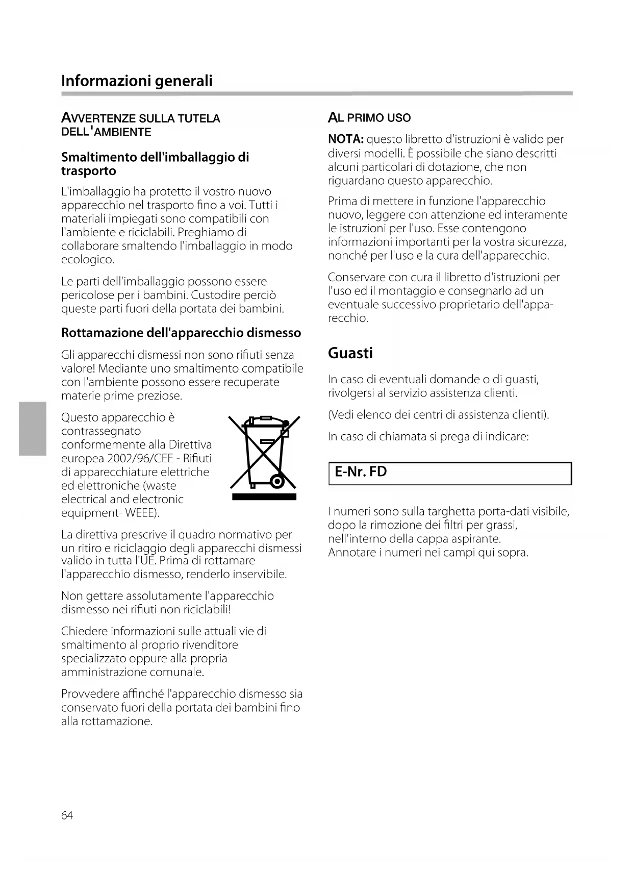 DELL 'AMBIENTE Smaltimento dell'imballaggio di trasporto L'imballaggio ha protetto il vostro nuovo apparecchio nel trasporto no a voi. Tutti i materiali impiegati sono compatibili con l'ambiente e riciclabili. Preghiamo di collaborare smaltendo l'imballaggio in modo ecologico. Le parti dell'imballaggio possono essere pericolose per i bambini. Custodire perciò queste parti fuori della portata dei bambini. Rottamazione dell'apparecchio dismesso Gli apparecchi dismessi non sono riuti senza valore! Mediante uno smaltimento compatibile con l'ambiente possono essere recuperate materie prime preziose. Questo apparecchio è contrassegnato conformemente alla Direttiva europea 2002/96/CEE - Riuti di apparecchiature elettriche ed elettroniche (waste electrical and electronic equipment- WEEE). La direttiva prescrive il quadro normativo per un ritiro e riciclaggio degli apparecchi dismessi valido in tutta l'UE. Prima di rottamare l'apparecchio dismesso, renderlo inservibile. Non gettare assolutamente l'apparecchio dismesso nei riuti non riciclabili! Chiedere informazioni sulle attuali vie di smaltimento al proprio rivenditore specializzato oppure alla propria amministrazione comunale. Provvedere anché l'apparecchio dismesso sia conservato fuori della portata dei bambini no alla rottamazione. Guasti In caso di eventuali domande o di guasti, rivolgersi al servizio assistenza clienti. (Vedi elenco dei centri di assistenza clienti). In caso di chiamata si prega di indicare: I numeri sono sulla targhetta porta-dati visibile, dopo la rimozione dei ltri per grassi, nell'interno della cappa aspirante. Annotare i numeri nei campi qui sopra. Informazioni generali )65 Uso regolare