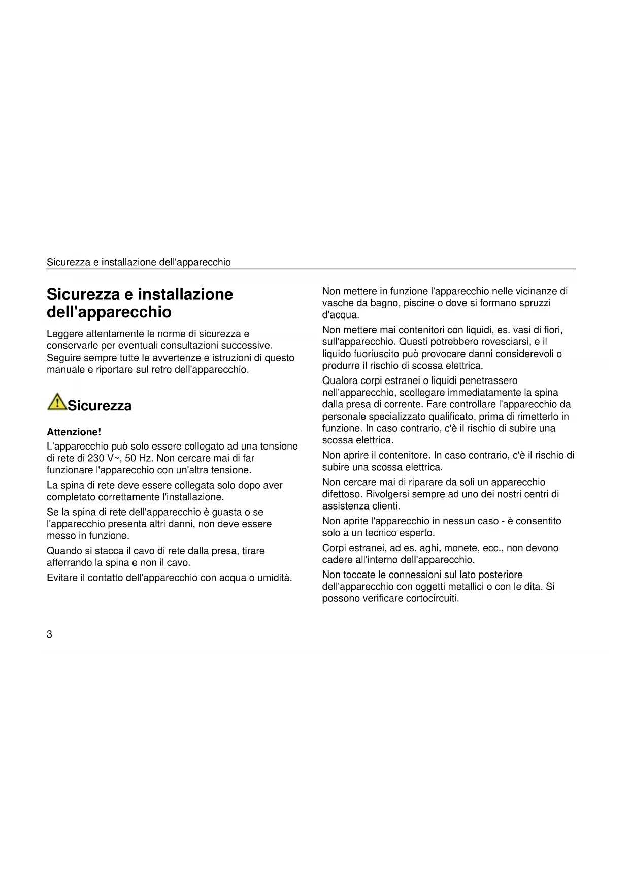 Qualora corpi estranei o liquidi penetrassero nell'apparecchio, scollegare immediatamente la spina alla presa di corrente. Fare controllare l'apparecchio da personale specializzato qualificato, prima di rimetterlo in funzione. In caso contrario, c'è il rischio di subire una scossa elettrica.