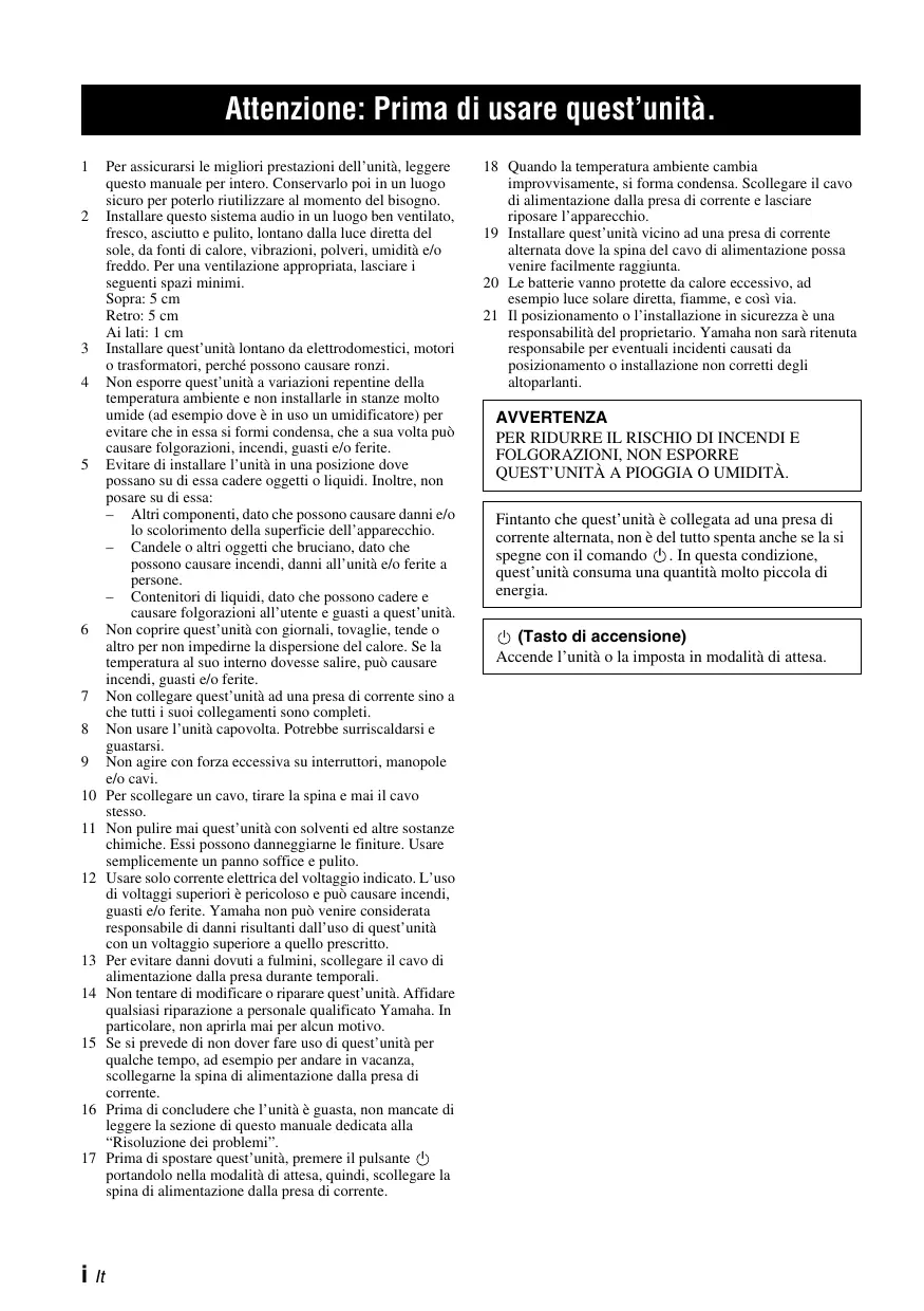 Consultez le service Yamaha compétent pour toute réparation qui serait requise. Le coffret de l’appareil ne doit jamais être ouvert, quelle que soit la raison. 15 Si vous envisagez de ne pas vous servir de l’appareil pendant une longue période (par exemple, pendant les vacances), débranchez la fiche du câble d’alimentation au niveau de la prise secteur. 16 Lisez la section intitulée « Guide de dépannage » où figurent une liste d’erreurs de manipulation communes avant de conclure que l’appareil présente une anomalie de fonctionnement. 17 Avant de déplacer l’appareil, appuyez sur pour placer l’appareil en veille puis débranchez la fiche du câble d’alimentation au niveau de la prise secteur. 18 La condensation se forme lorsque la température ambiante change brusquement. En ce cas, débranchez la fiche du câble d’alimentation et laissez l’appareil reposer. 19 Installez cet appareil à proximité de la prise secteur et à un emplacement où la fiche du câble d’alimentation est facilement accessible. 20 Les piles ne doivent pas être exposées à une chaleur extrême, par exemple au soleil, à une flamme, etc. 21 Le propriétaire est responsable d’installer correctement les composants. Yamaha ne peut être tenue responsable de toute installation incorrecte des enceintes.