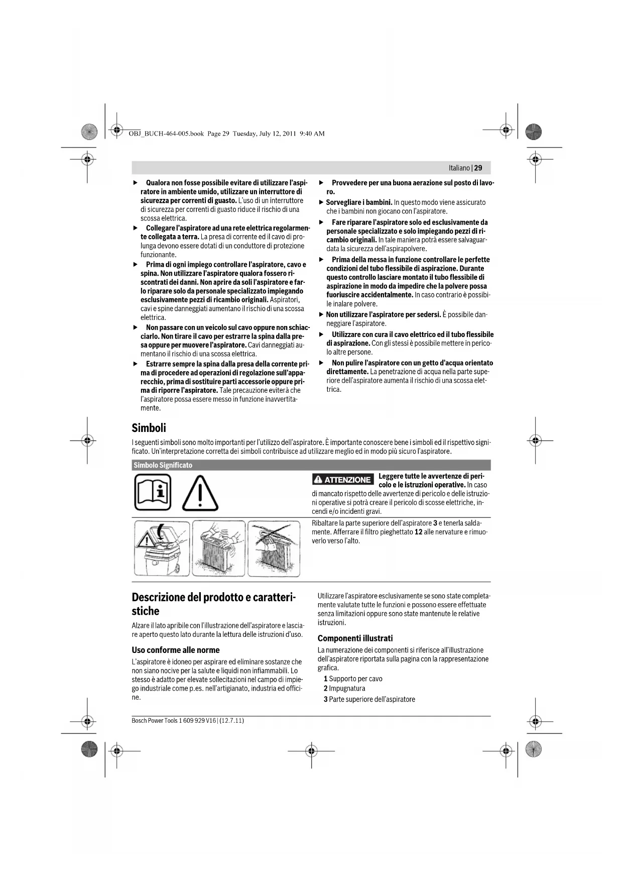 AVVERTENZA AVVERTENZA AVVERTENZA AVVERTENZA AVVERTENZA ATTENZIONE ATTENZIONE OBJ_BUCH-464-005.book Page 28 Tuesday, July 12, 2011 9:40 AMItaliano | 29 Bosch Power Tools 1 609 929 V16 | (12.7.11) f Qualora non fosse possibile evitare di utilizzare l’aspi-