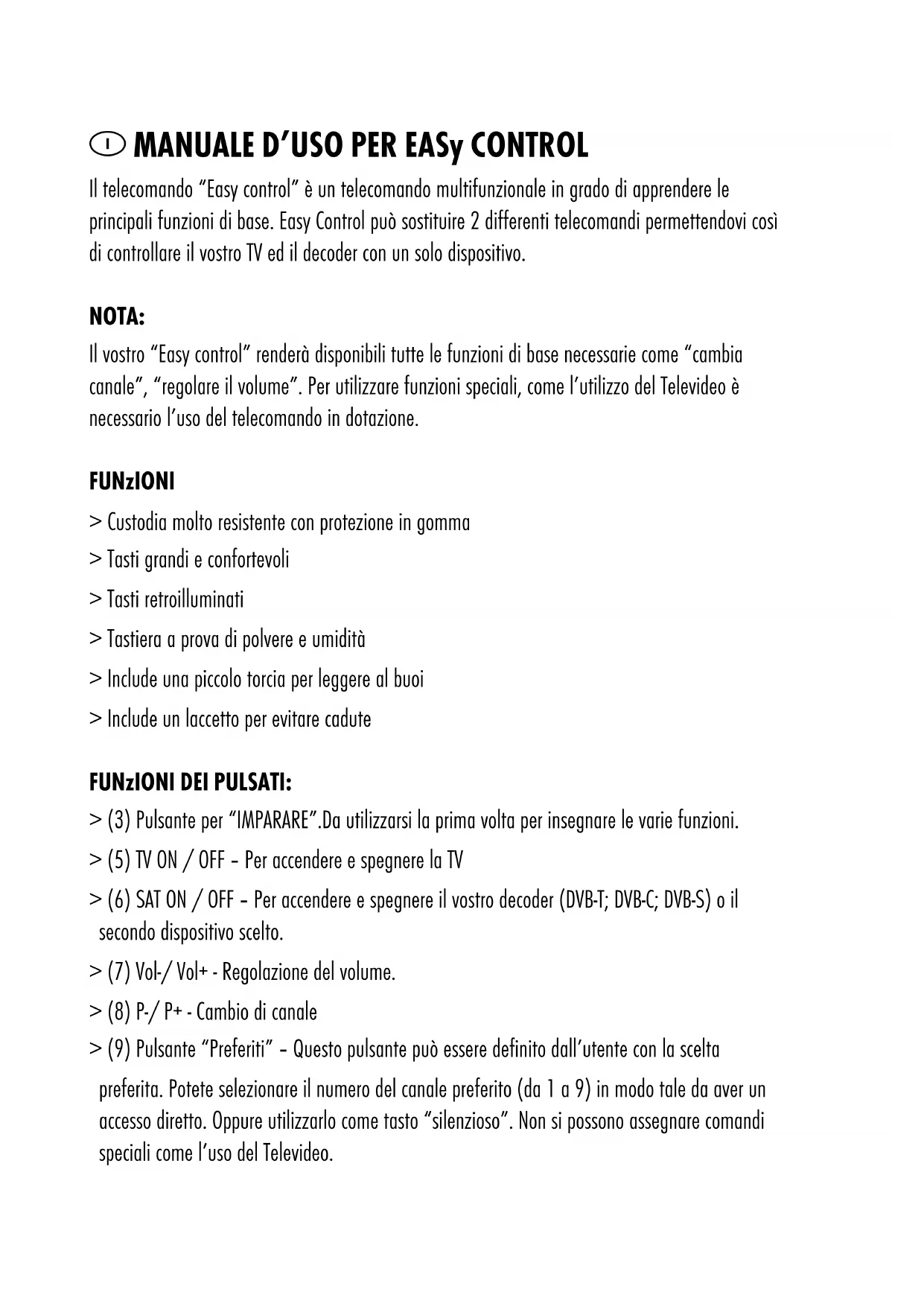 TV ili resiver na reagiraju na Easy control > Baterije u Easy control moraju se zamjeniti > Programiranje nije bilo uspješno za odgovarajuću tipku. U tom slučaju ponovite programiranje dok sve tipke ne rade ispravno > Udaljenost između Tv ili Resivera i Easy control je prevelika (max. Udaljenost 5-7 m) > Easy control nije u ravnini sa Tv ili Resivera . Molim držite Easy control u smjeru Tv ili Resivera. Funkcijski LED (4) ne treperi ( vidi korak e. Kod programiranja) > Baterije u originalnom daljinskom su preslabe > Funkcijski ključ originalnog daljinskog ne radi > Udaljenost infracrvenih senzora od obadva daljinska nije dobra! GARANCIJA Pružamo jamstvo od 3 godine prema navedenim uvjetima . Ukoliko imate pitanja o rukovanju i funkcijama uređaja. Dobrodošli ste kontaktirati naš servisni odjel na www.ansmann.de Jamstvo se ne priznaje u slijedećim uvijetima: > Greška u rukovanju > Neovlašteno otvaranje> Mehanička oštačenja > Kvarovi usljed vlage neodgovornim rukovanjem > Bez dokaza o kupnji i trajanju jamsvenog roka > Mala snaga uslijed neispravnih baterija ISTROšENE BATERIjE Ne bacajte istrošene baterije u kućni otpad. Prikupljene baterije odložite na mjesto za prikupljanje ili vratite ovlaštenom distributeru. OPREz: > Strujne kontakte ne dovodite u kratki spoj > Punjive baterije trebaju biti punjene uz nadzor odraslih osoba > Punjive baterije ukloniti iz uređaja prije punjenja > Ne punjive baterije ne punite > Istrošene baterije izvaditi iz uređaja > Ne mješajte nove i istrošene baterije > Pakiranje i upute spremite , jer sadrže važne informacijeI MANUALE D’USO PER EASy CONTROL Il telecomando “Easy control” è un telecomando multifunzionale in grado di apprendere le principali funzioni di base. Easy Control può sostituire 2 differenti telecomandi permettendovi così di controllare il vostro TV ed il decoder con un solo dispositivo. NOTA: Il vostro “Easy control” renderà disponibili tutte le funzioni di base necessarie come “cambia canale”, “regolare il volume”. Per utilizzare funzioni speciali, come l’utilizzo del Televideo è necessario l’uso del telecomando in dotazione. FUNzIONI > Custodia molto resistente con protezione in gomma > Tasti grandi e confortevoli > Tasti retroilluminati > Tastiera a prova di polvere e umidità > Include una piccolo torcia per leggere al buoi > Include un laccetto per evitare cadute FUNzIONI DEI PULSATI: > (3) Pulsante per “IMPARARE”.Da utilizzarsi la prima volta per insegnare le varie funzioni. > (5) TV ON / OFF – Per accendere e spegnere la TV > (6) SAT ON / OFF – Per accendere e spegnere il vostro decoder (DVB-T; DVB-C; DVB-S) o il secondo dispositivo scelto. > (7) Vol-/ Vol+ - Regolazione del volume. > (8) P-/ P+ - Cambio di canale > (9) Pulsante “Preferiti” – Questo pulsante può essere definito dall’utente con la scelta preferita. Potete selezionare il numero del canale preferito (da 1 a 9) in modo tale da aver un accesso diretto. Oppure utilizzarlo come tasto “silenzioso”. Non si possono assegnare comandi speciali come l’uso del Televideo.> (10) Per accendere la torcia ISTRUzIONI DI SICUREzzA > Leggere attentamente il manuale delle istruzioni prima dell’utilizzo. > Non tentare di aprire il telecomando. > Non esponete il telecomando ad alte temperature e/o all’acqua o umidità molto elevata. > Per pulire il telecomando utilizzate un panno asciutto. > Tenetelo lontano dai bambini. > Il non rispetto delle istruzioni di sicurezza possono causare danni al telecomando o esporre a rischi l’utente. COME FUNzIONA Aprite il vano delle batterie (1) sul retro ed inserite le pile seguendo la corretta polarità. (all’interno del vano batterie troverete un disegno riportante la giusta collocazione delle stesse). Richiudete il vano batterie. COME INSEGNARE I GIUSTI COMANDI AL VOSTRO EASy CONTROL: Place the Easy control as well as the original remote controls on the table. a. Aprire lo sportello (2) del vostro Easy Control b. Premete, e mantenete premuto, il tasto “IMPARA” (3) finchè il LED delle funzioni (4) lampeg- gia velocemente. Ora il vostro Easy Control è in modalità “impara”. c. Premete il pulsante del vostro Easy Control al quale volete assegnare una funzione.Il LED (4) sarà luminoso. d. Posizionate il vostro telecomando originale a circa 3-5 mm dal vostro Easy control. E’ impor- tante che il sensore a infrarossi dei due telecomandi siano uno di fronte all’altro. Solitamente i sensori dei telecomandi sono posizionati sulla parte anteriore. Il sensore a infrarossi (12) dell’Easy Control è accanto alla luce della torcia (11).E’ importante posizionare I telecomandi come mostrato nella figura per garantire una corretta trasmissione. e. Premete, e mantenete premuto, il pulsante del telecomando originale. Il vostro Easy Control segnalerà la ricezione dei dati attraverso un lento lampeggio del LED (4) e, ad apprendimentoultimato il LED (4) inizierà a lampeggiare velocemente. f. Quando vedrete lampeggiare il LED (4) rapidamente potrete passare al tasto successivo che volete memorizzare sul vostro Easy Control.. g. Ripetete questi passi per tutti i tasti che volete memorizzare. h. Premete il tasto “Impara” (3) per terminare l’operazione e memorizzare la sequenza dei tasti desiderata. Il LED (4) si spegnerà per segnalare che l’operazione è terminate.