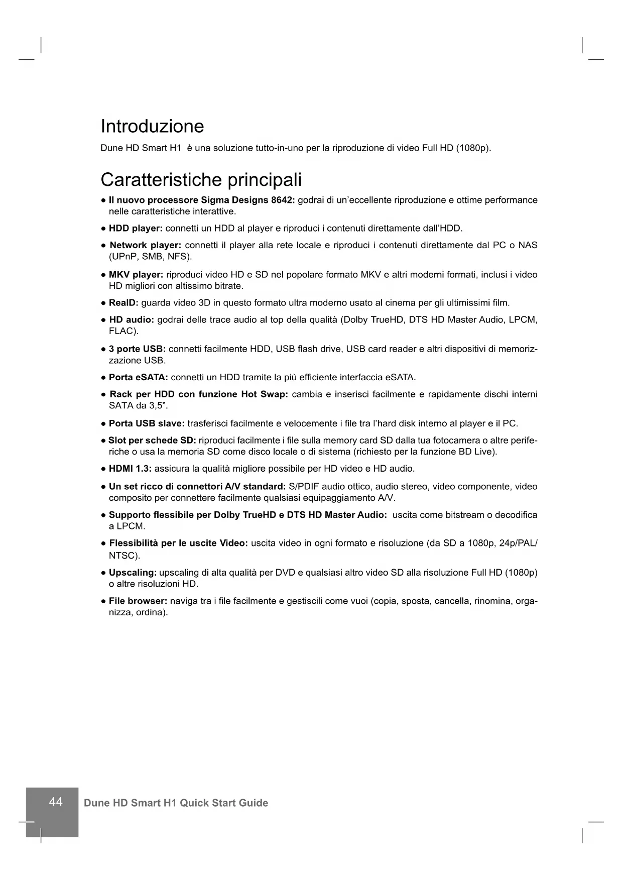 Dopo che le immagini sono apparse sulla TV, premi il tasto “ENTER” e poi vai nel menu di impostazioni del player per confi gurare in modo più preciso l’uscita video se necessario. NOTA: la procedura di impostazione rapida dell’uscita video non può essere utilizzata durante la riproduzione di un video. Per assicurarsi che questa procedura sia utilizzabile, spegni il player e poi riaccendilo e aspetta circa un minuto per assicurarti che la procedura di avvio sia terminata.49 Usare HDD Interni Per inserire un disco interno da 3.5” SATA, assicurati di essere nella schermata principale del menu, apri lo sportello del rack per HDD, inserisci l’HDD nel rack e chiudi lo sportello. Il player riconoscerà il disco interno e mostrerà l’icona corrispondente nel menu principale. Non rimuovere l’HDD quando vi sono operazioni di scrittura in corso. È consigliabile usare HDD “green” con un basso valore di RPM, bassa produzione di calore e bassi con- sumi; per informazioni ulteriori vedi questa pagina: http://dune-hd.com/support/hw_compat/ Connettere Periferiche USB Per connettere periferiche USB, assicurati di essere nella schermata principale del menu e connetti la periferica USB in una delle porte USB del player. Il player riconoscerà tale periferica e mostrerà l’icona corrispondente alla periferica USB nella schermata principale. Quando connetti una periferica USB che richiede una quantità signifi cativa di energia (come gli Hard Disk USB), usa un alimentatore esterno per tale periferica. La potenza erogata dalle porte USB del player po- trebbe non essere suffi ciente per alimentare la periferica USB e funzionare correttamente. Non disconnettere o spegnere la periferica USB quando vi sono operazioni di scrittura in corso. Usare Memory Card SD Per inserire una memoria SD, assicurati di essere nella schermata principale del menu e inserisci la me- mory card nel lettore di memory card del player. Il player riconoscerà tale memory card e mostrerà un’ico- na corrispondente nel menu principale. Alcune memorie SD possono non essere riconosciute dal player e non funzionare correttamente; in questo caso, usa un altro modello di memory card SD. Non estrarre la memory card SD quando sono in corso operazioni di scrittura. Connettere periferiche eSATA Per connettere periferiche eSATA, spegni sia il player che la periferica eSATA, connetti la periferica eSATA alla porta eSATA del player (e connetti la periferica eSATA al suo alimentatore), accendi la periferica eSA- TA e, come ultimo passaggio, accendi il player. Il player riconoscerà la periferica eSATA e mostrerà l’icona corrispondente nel menu principale. Spegni e disconnetti la periferica eSATA solo dopo aver spento il player. Usare la funzione USB Slave Per connettere il player con installato un HDD interno tramite l’USB Slave, spegni il player, connetti la porta USB Slave del player a una porta USB del PC e poi accendi il player. Il PC riconoscerà una nuova periferica USB. Dopo aver utilizzato il player col PC, assicurati che la periferica USB sia correttamente rimossa dal pc (“Rimozione Sicura Hardware” o funzioni simili), spegni il player e poi disconnetti la porta USB Slave. Accedere ai dispositivi di Rete Per connettere un dispositivo di rete che utilizza il protocollo SMB (Samba) o NFS, assicurati di essere nel menu principale del player, premi il tasto del telecomando “MENU” e scegli “Crea una cartella di Rete” (in inglese “Create Network Folder”), poi inserisci i parametri del dispositivo di rete come richiesto. Il player mostrerà un’icona corrispondente al dispositivo di rete appena confi gurato nella schermata principale. Italiano50 Dune HD Smart H1 Quick Start Guide Per accedere a una lista di risorse di rete disponibili tramite i protocolli SMB o UPnP, usa l’icona nel menu principale “Network Browser”. NOTA: se qualche risorsa di rete non è mostrata dal player, può essere che tu debba aspettare qualche minuto e poi riprovare (o premere “MENU” sul telecomando e scegliere “Aggiorna”). Formattare l’HDD Per formattare l’HDD collegato al player, seleziona l’icona corrispondente al disco nel menu principale del player, premi il tasto “INFO” sul telecomando e seleziona “Formatta Disco” (per formattare l’intero disco) o “Formatta Partizione” (per formattare una sola partizione già esistente sul disco). Il player formatterà il disco utilizzando il fi le system “EXT2”- NOTA: per usare dischi formattati dal player su un PC con Windows, avrai bisogno di installare software appositi come “EXT2FSD” (http://www.ext2fsd.com/). Spegnere e Accendere il player Per accendere il player assicurati di aver posizionato su On l’interruttore sul retro e premi il tasto sul teleco- mando “POWER” o il tasto “on/off” sul pannello frontale. Per mettere il player in modalità standby, premi il tasto “POWER” sul telecomando o il tasto “on/off” sul pan- nello frontale. Per uscire dalla modalità standby premi uno di quei bottoni ancora. A seconda delle impostazioni del player (vedi il menu impostazioni), potrà essere utilizzato l’”hardware standby”o il “softwarre standby”. In modalità “hardware standby” si avrà uno spegnimento più completo e il player non consumerà quasi nulla. In modalità “software standby” il player non produce alcun segnale video, ma il player è ancora in funzione. Per esempio, se hai qualche periferica di memorizzazione collegata al player, puoi continuare ad accedere ad essa dalla rete (funzione “NAS”). Per uscire dalla modalità “software standby” occorrono pochi secondi. Quando è in modalità “software standby” il consumo energetico è signifi - cativo. Non è raccomandato tenere il player in “software standby” per molto tempo se non lo utilizzi. Per spegnere il player completamente, utilizzare il tasto on/off sul pannello posteriore. Non farlo mentre qualche periferica è connessa al player o s