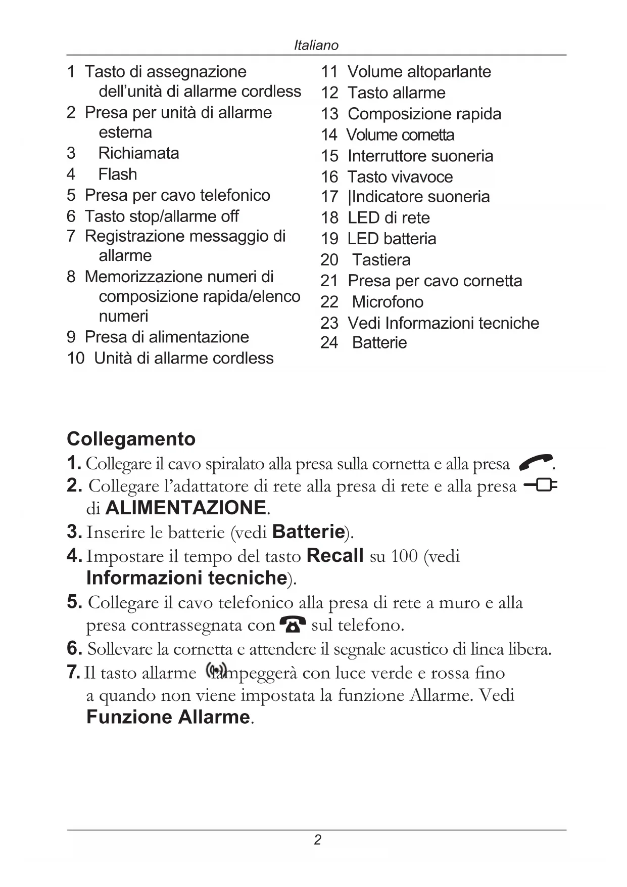 Italiano 1 Tasto di assegnazione dell’unità di allarme cordless 2 Presa per unità di allarme esterna 3 Richiamata 4 Flash 5 Presa per cavo telefonico 6 Tasto stop/allarme off 7 Registrazione messaggio di allarme 8 Memorizzazione numeri di composizione rapida/elenco numeri 9 Presa di alimentazione 10 Unità di allarme cordless 11 Volume altoparlante 12 Tasto allarme 13 Composizione rapida 14 Volume cornetta 15 Interruttore suoneria 16 Tasto vivavoce 17 |Indicatore suoneria 18 LED di rete 19 LED batteria 20 Tastiera 21 Presa per cavo cornetta 22 Microfono 23 Vedi Informazioni tecniche 24 Batterie Collegamento