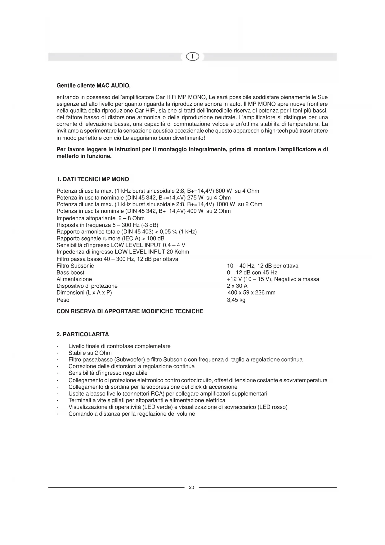 Gentile cliente MAC AUDIO, entrando in possesso dell’amplificatore Car HiFi MP MONO, Le sarà possibile soddisfare pienamente le Sue esigenze ad alto livello per quanto riguarda la riproduzione sonora in auto. Il MP MONO apre nuove frontiere nella qualità della riproduzione Car HiFi, sia che si tratti dell’incredibile riserva di potenza per i toni più bassi, del fattore basso di distorsione armonica o della riproduzione neutrale. L’amplificatore si distingue per una corrente di elevazione bassa, una capacità di commutazione veloce e un’ottima stabilita di temperatura. La invitiamo a sperimentare la sensazione acustica eccezionale che questo apparecchio high-tech può trasmettere in modo perfetto e con ciò Le auguriamo buon divertimento! Per favore leggere le istruzioni per il montaggio integralmente, prima di montare l’amplificatore e di metterlo in funzione.