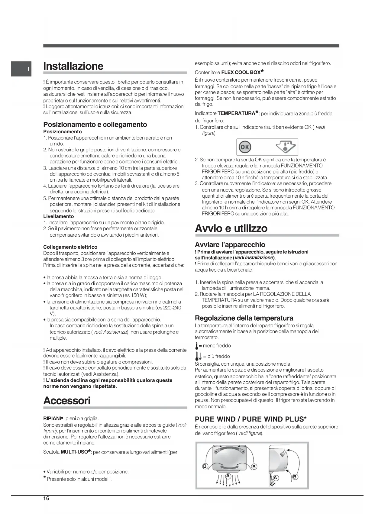 Leggere attentamente le istruzioni: ci sono importanti informazionisull’installazione, sull’uso e sulla sicurezza. Posizionamento e collegamento Posizionamento1. Posizionare l’apparecchio in un ambiente ben aerato e nonumido.2. Non ostruire le griglie posteriori di ventilazione: compressore econdensatore emettono calore e richiedono una buonaaerazione per funzionare bene e contenere i consumi elettrici.3. Lasciare una distanza di almeno 10 cm tra la parte superioredell’apparecchio ed eventuali mobili sovrastanti e di almeno 5cm tra le fiancate e mobili/pareti laterali.4. Lasciare l’apparecchio lontano da fonti di calore (la luce solarediretta, una cucina elettrica).5. Per mantenere una ottimale distanza del prodotto dalla pareteposteriore, montare i distanzieri presenti nel kit di installazioneseguendo le istruzioni presenti sul foglio dedicato.Livellamento1. Installare l’apparecchio su un pavimento piano e rigido.2. Se il pavimento non fosse perfettamente orizzontale,compensare svitando o avvitando i piedini anteriori.Collegamento elettricoDopo il trasporto, posizionare l’apparecchio verticalmente eattendere almeno 3 ore prima di collegarlo all’impianto elettrico.Prima di inserire la spina nella presa della corrente, accertarsi che:• la presa abbia la messa a terra e sia a norma di legge;• la presa sia in grado di sopportare il carico massimo di potenzadella macchina, indicato nella targhetta caratteristiche posta nelvano frigorifero in basso a sinistra (es 150 W);• la tensione di alimentazione sia compresa nei valori indicati nellatarghetta caratteristiche, posta in basso a sinistra (es 220-240 V); • la presa sia compatibile con la spina dell’apparecchio.In caso contrario richiedere la sostituzione della spina a untecnico autorizzato (vedi Assistenza); non usare prolunghe emultiple.! Ad apparecchio installato, il cavo elettrico e la presa della correntedevono essere facilmente raggiungibili.! Il cavo non deve subire piegature o compressioni.! Il cavo deve essere controllato periodicamente e sostituito solo datecnici autorizzati (vedi Assistenza).! L’azienda declina ogni responsabilità qualora questenorme non vengano rispettate. Accessori RIPIANI•: pieni o a griglia.Sono estraibili e regolabili in altezza grazie alle apposite guide ( vedi figura), per l’inserimento di contenitori o alimenti di notevoledimensione. Per regolare l’altezza non è necessario estrarrecompletamente il ripiano.Scatola MULTI-USO * : per conservare a lungo vari alimenti (peresempio salumi); evita anche che si rilascino odori nel frigorifero.Contenitore FLEX COOL BOX * È il nuovo contenitore per mantenere freschi carne, pesce,formaggi. Se collocato nella parte "bassa" del ripiano frigo è l'idealeper carne e pesce; se spostato nella parte "alta" è ottimo performaggi. Se non è necessario, può essere comodamente estrattodal frigo.Indicatore TEMPERATURA * : per individuare la zona più freddadel frigorifero.1. Controllare che sull’indicatore risulti ben evidente OK ( vedi figura ). 2. Se non compare la scritta OK significa che la temperatura ètroppo elevata: regolare la manopola FUNZIONAMENTOFRIGORIFERO su una posizione più alta (più freddo) eattendere circa 10 h finché la temperatura si sia stabilizzata.3. Controllare nuovamente l’indicatore: se necessario, procederecon una nuova regolazione. Se si sono introdotte grossequantità di alimenti o si è aperta frequentemente la porta delfrigorifero, è normale che l’indicatore non segni OK. Attenderealmeno 10 h prima di regolare la manopola FUNZIONAMENTOFRIGORIFERO su una posizione più alta. Avvio e utilizzo