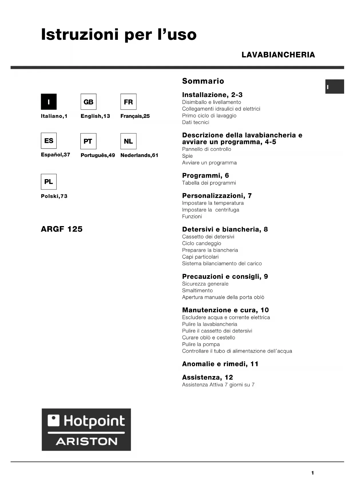 Italiano,1 Sommario Installazione, 2-3 Disimballo e livellamento Collegamenti idraulici ed elettrici Primo ciclo di lavaggio Dati tecnici Descrizione della lavabiancheria e avviare un programma, 4-5 Pannello di controllo Spie Avviare un programma Programmi, 6 Tabella dei programmi Personalizzazioni, 7 Impostare la temperatura Impostare la centrifuga Funzioni Detersivi e biancheria, 8 Cassetto dei detersivi Ciclo candeggio Preparare la biancheria Capi particolari Sistema bilanciamento del carico Precauzioni e consigli, 9 Sicurezza generale Smaltimento Apertura manuale della porta oblò Manutenzione e cura, 10 Escludere acqua e corrente elettrica Pulire la lavabiancheria Pulire il cassetto dei detersivi Curare oblò e cestello Pulire la pompa Controllare il tubo di alimentazione dellacqua Anomalie e rimedi, 11 Assistenza, 12 Assistenza Attiva 7 giorni su 7