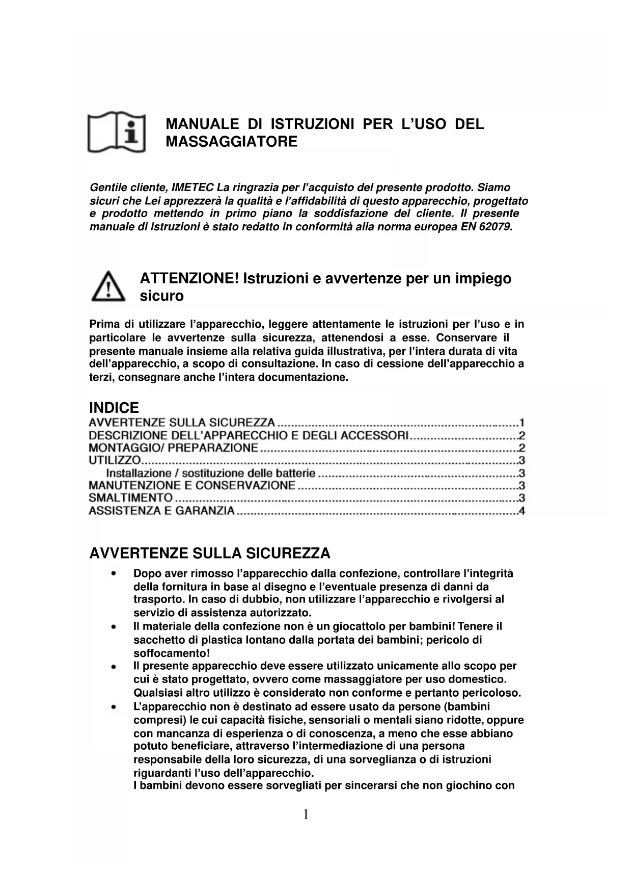 MANUALE DI ISTRUZIONI PER L’USO DEL MASSAGGIATORE Gentile cliente, IMETEC La ringrazia per l’acquisto del presente prodotto. Siamo