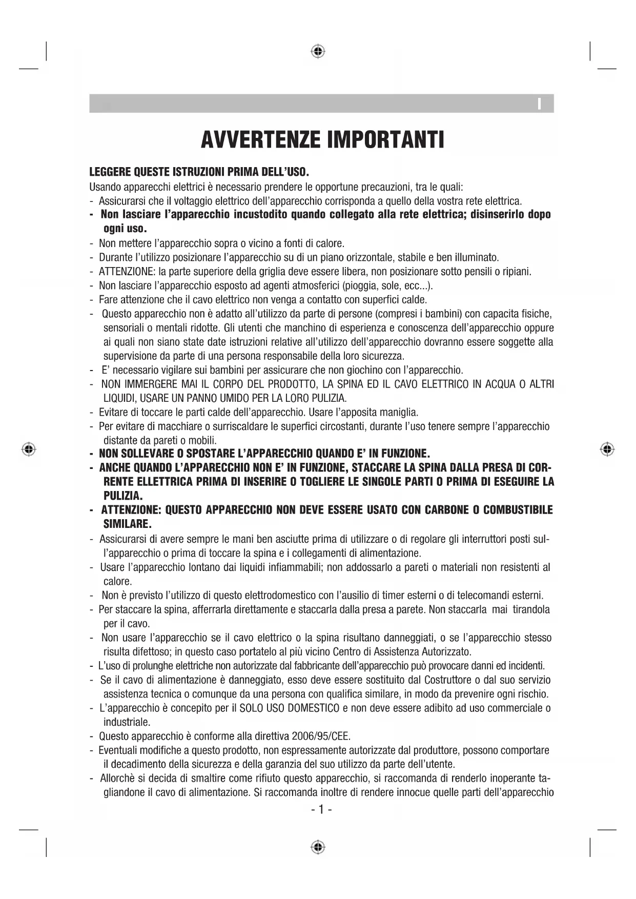 ISTRUZIONI PER L’USO ATTENZIONE: Prima di utilizzare l’apparecchio, rimuovere le pellicole protettive ove presenti.