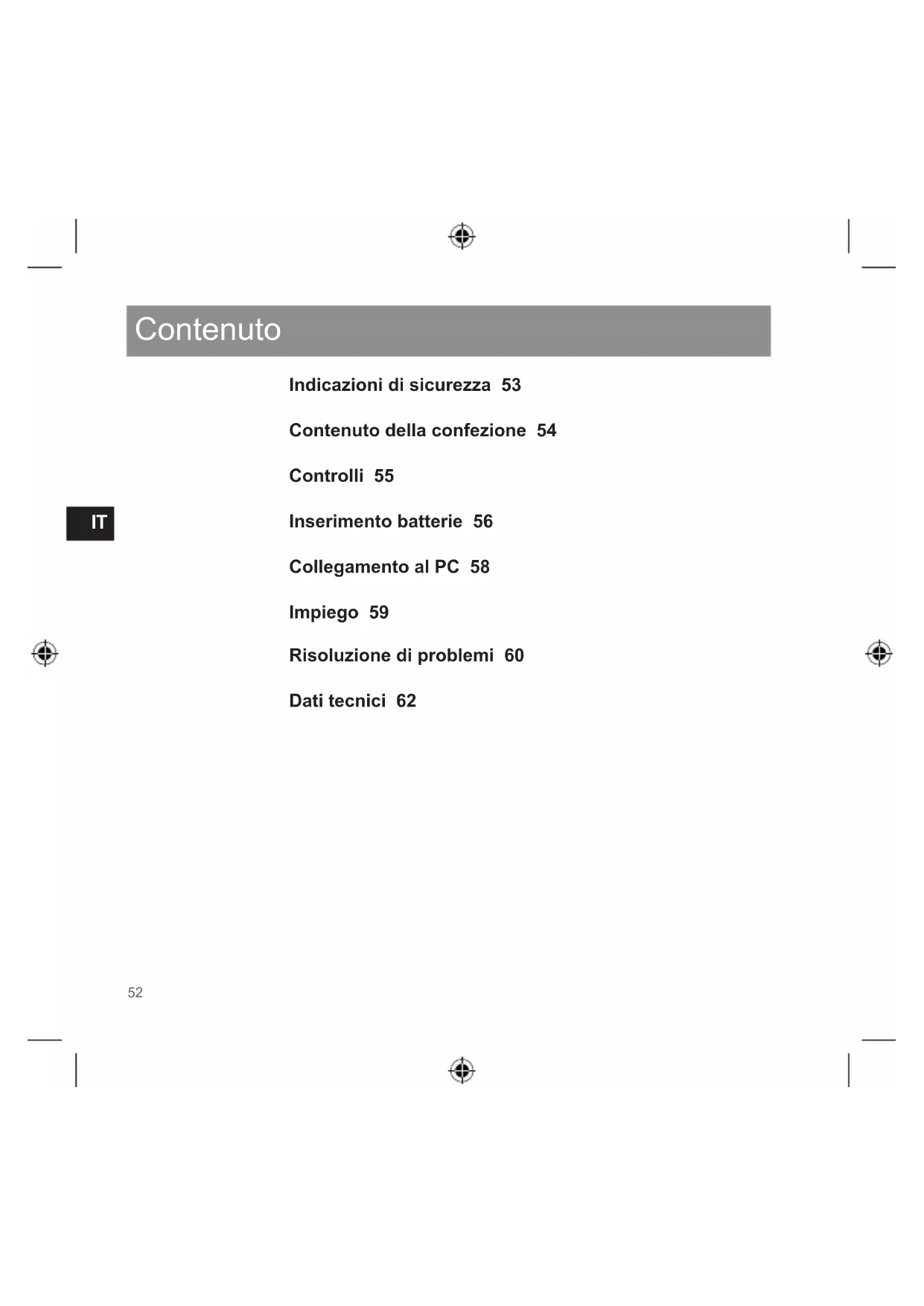 Indicazioni di sicurezza 53 Contenuto della confezione 54 Controlli 55 Inserimento batterie 56 Collegamento al PC 58 Impiego 59 Risoluzione di problemi 60 Dati tecnici 62 ContenutoIT